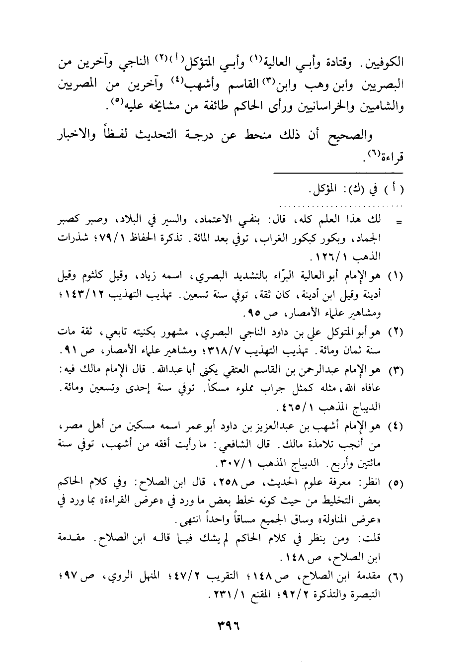 (¬5) انظر: معرفة علوم الحديث، ص 258، قال ابن الصلاح: وفي كلام الحاكم بعض التخليط من حيث كونه خلط بعض ما ورد في "عرض القراءة" بما ورد في "عرض المناولة" وساق الجميع مساقًا واحدًا انتهى.