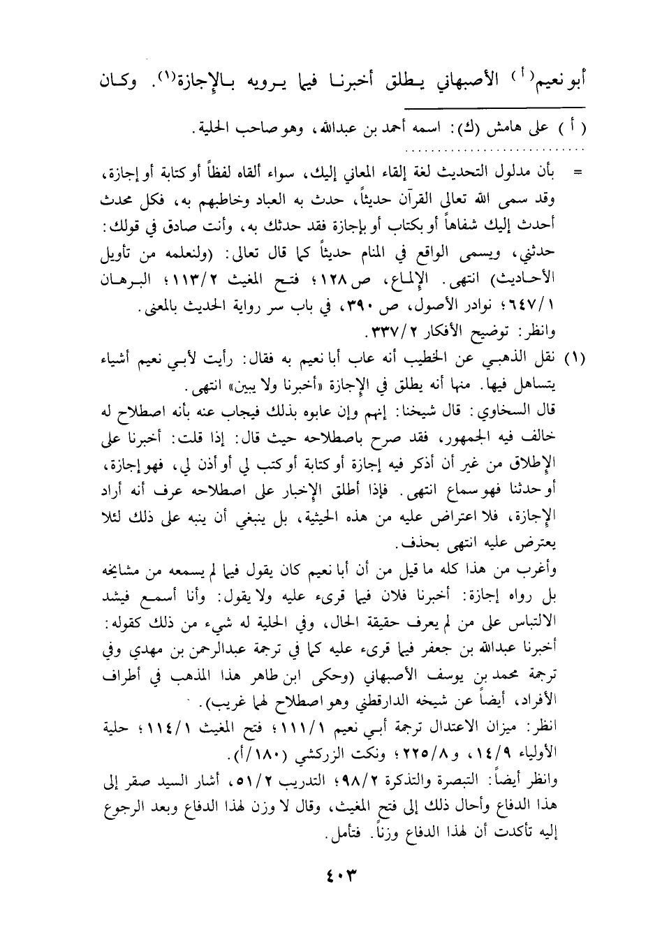 (¬1) نقل الذهبي عن الخطيب أنه عاب أبا نعيم به فقال: رأيت لأبي نعيم أشياء يتساهل فيها. منها أنه يطلق في الإِجازة "أخبرنا ولا يبين" انتهى.