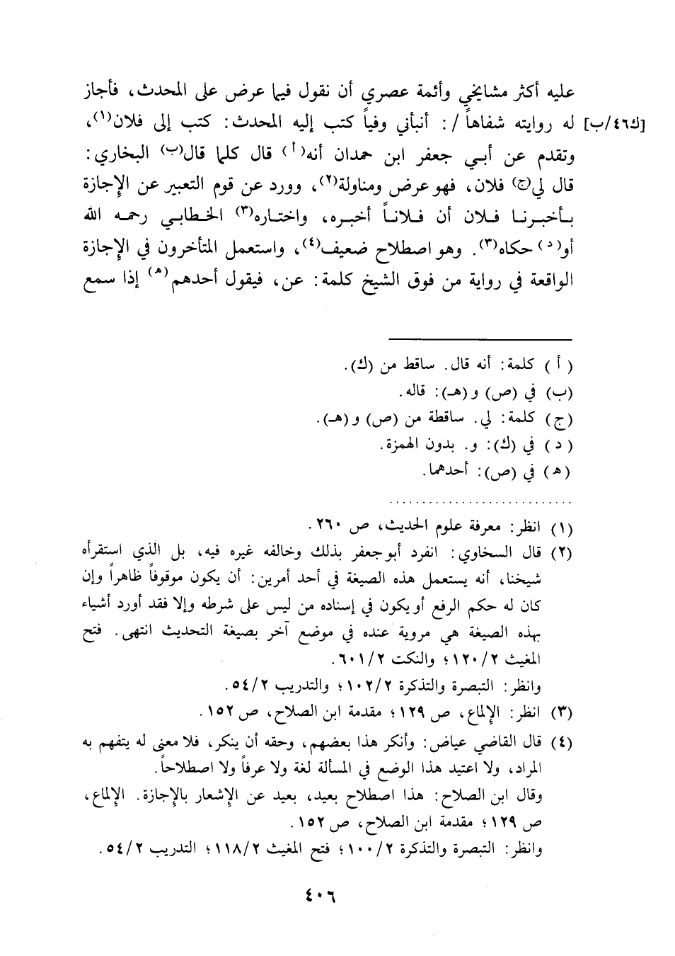 عليه أكثر مشايخي وأئمة عصري أن نقول فيما عرض على المحدث، فأجاز له روايته شفاهًا: أنبأني وفيًا كتب إليه المحدث: كتب إلى فلان (¬1)، وتقدم عن أبي جعفر بن حمدان أنه (أ) قال كلما قال (ب) البخاري: قال لي (ج) فلان، فهو عرض ومناولة (¬2)، وورد عن قوم التعبير عن الإِجازة بأخبرنا فلان أن فلانًا أخبره، واختاره (3) الخطابي رحمه الله أو (د) حكاه (¬3). وهو اصطلاح ضعيف (¬4)، واستعمل المتأخرون في الإِجازة الواقعة في رواية من فوق الشيخ كلمة: عن، فيقول أحدهم (هـ) إذا سمع