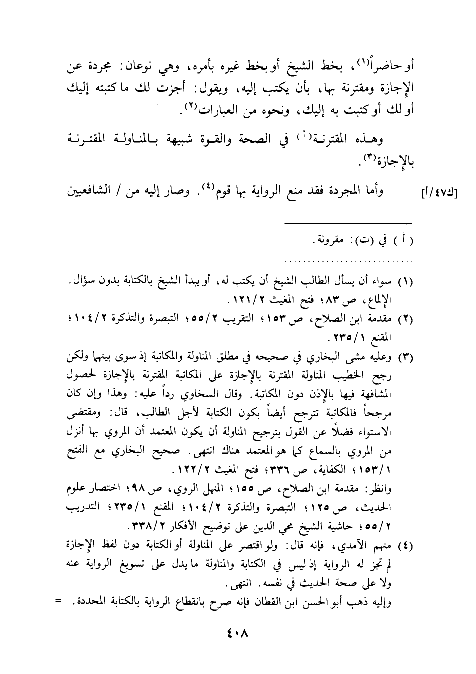 (¬1) سواء أن يسأل الطالب الشيخ أن يكتب له، أو يبدأ الشيخ بالكتابة بدون سؤال. الإِلماع، ص 83؛ فتح المغيث 2/ 121.
