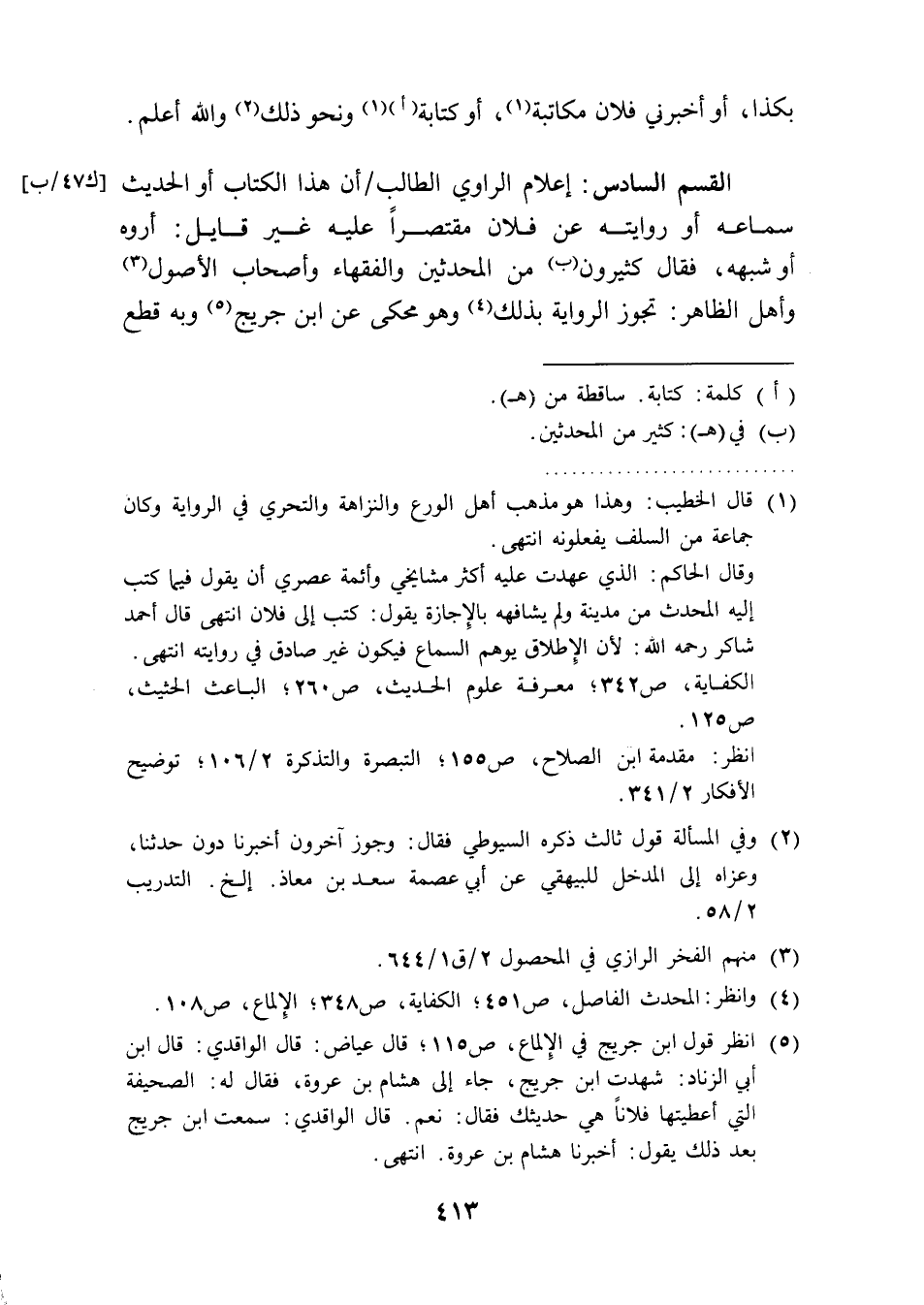(¬4) وانظر: المحدث الفاصل، ص 451؛ الكفاية، ص 348؛ الإِلماع، ص 108.