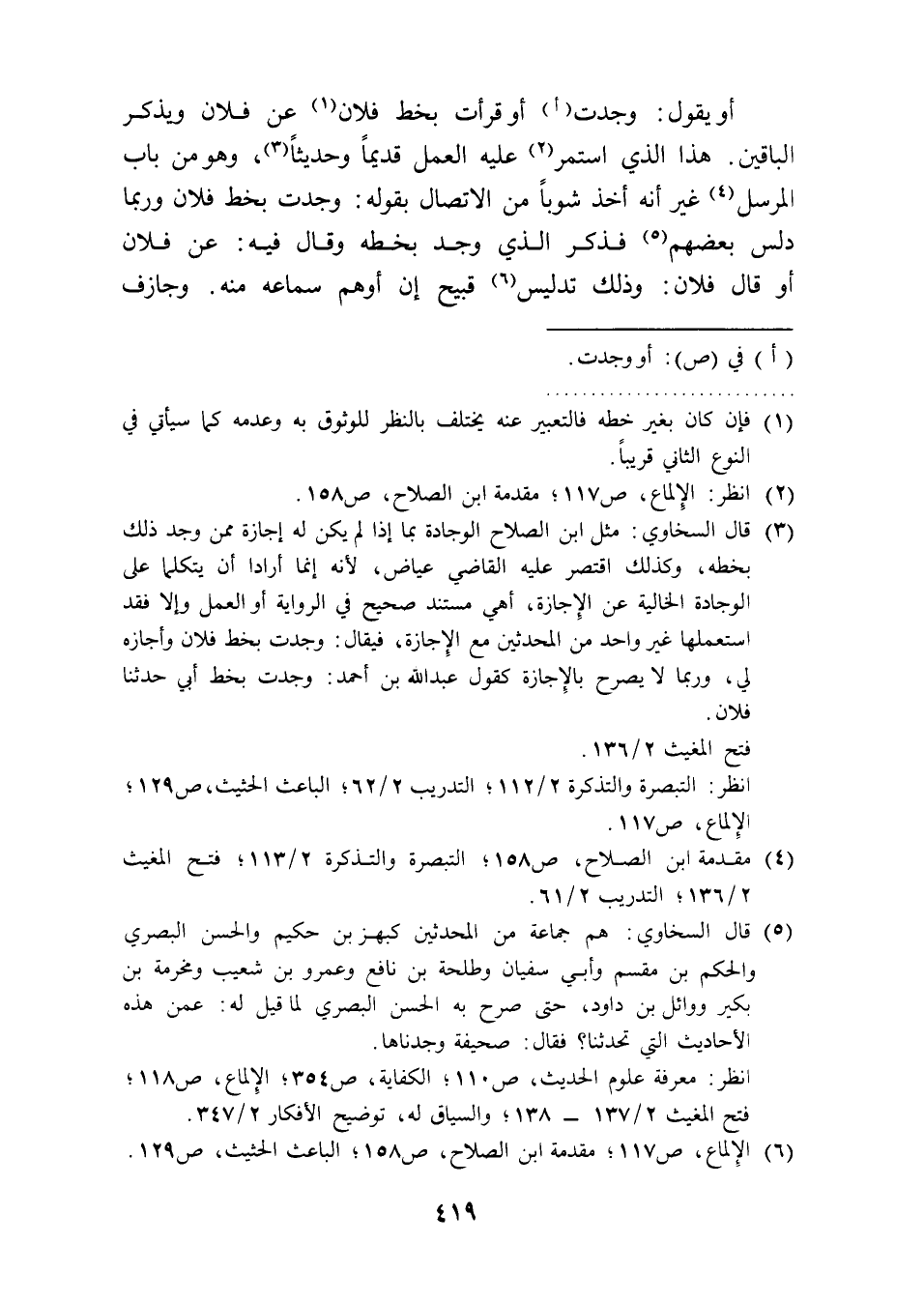 أو يقول: وجدت (أ) أو قرأت بخط فلان (¬1) عن فلان ويذكر الباقين. هذا الذي استمر (¬2) عليه العمل قديمًا وحديثًا (¬3)، وهو من باب المرسل (¬4) غير أنه أخذ شوبًا من الاتصال بقوله: وجدت بخط فلان وربما دلس بعضهم (¬5) فذكر الذي وجد بخطه وقال فيه: عن فلان أو قال فلان: وذلك تدليس (¬6) قبيح إن أوهم سماعه منه. وجازف