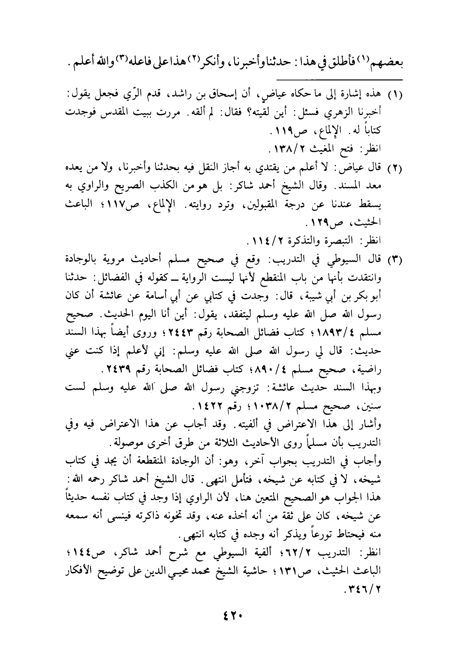 (¬1) هذه إشارة إلى ما حكاه عياضٍ، أن إسحاق بن راشد، قدم الرّي فجعل يقول: أخبرنا الزهري فسئل: أين لقيته؟ فقال: لم ألقه. مررت ببيت المقدس فوجدت كتابًا له. الإِلماع، ص 119.