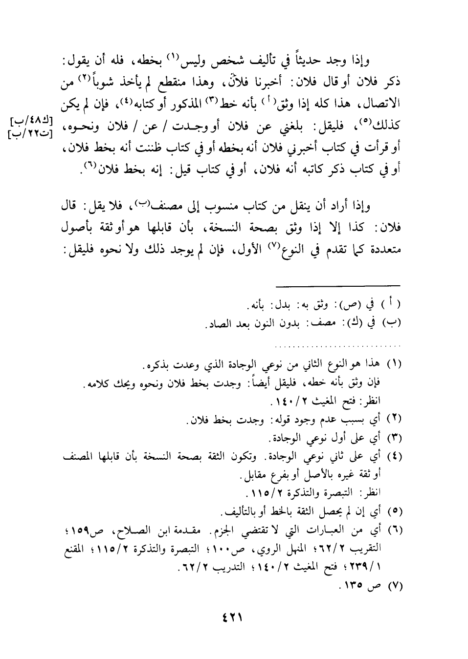 وإذا وجد حديثًا في تأليف شخص وليس (¬1) بخطه، فله أن يقول: ذكر فلان أو قال فلان: أخبرنا فلان، وهذا منقطع لم يأخذ شوبًا (¬2) من الاتصال، هذا كله إذا وثق (أ) بأنه خط (¬3) المذكور أو كتابه (¬4)، فإن لم يكن كذلك (¬5)، فليقل: بلغني عن فلان أو وجدت عن فلان ونحوه، أو قرأت في كتاب أخبرني فلان أنه بخطه أو في كتاب ظننت أنه بخط فلان، أو في كتاب ذكر كاتبه أنه فلان، أو في كتاب قيل: إنه بخط فلان (¬6).