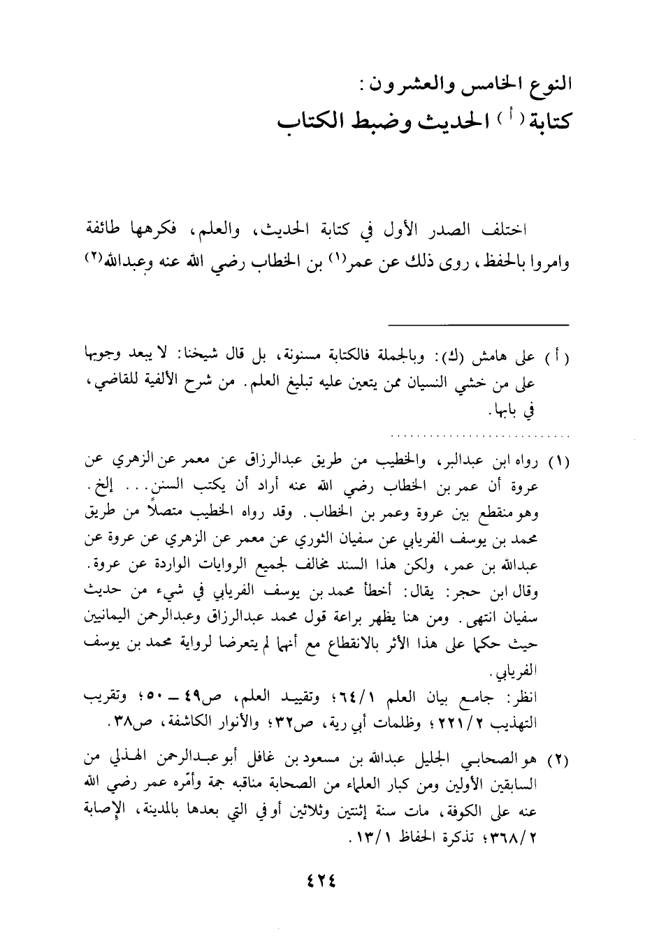 (¬1) رواه ابن عبد البر، والخطيب من طريق عبد الرزاق عن معمر عن الزهري عن عروة أن عمر بن الخطاب رضي الله عنه أراد أن يكتب السنن ... إلخ. وهو منقطع بين عروة وعمر بن الخطاب. وقد رواه الخطيب متصلًا من طريق محمد بن يوسف الفريابي عن سفيان الثوري عن معمر عن الزهري عن عروة عن عبد الله بن عمر، ولكن هذا السند مخالف لجميع الروايات الواردة عن عروة. وقال ابن حجر: يقال: أخطأ محمد بن يوسف الفريابي في شيء من حديث سفيان انتهى. ومن هنا يظهر براعة قول محمد عبد الرزاق وعبد الرحمن اليمانيين حيث حكما على هذا الأثر بالانقطاع مع أنهما لم يتعرضا لرواية محمد بن يوسف الفريابي.