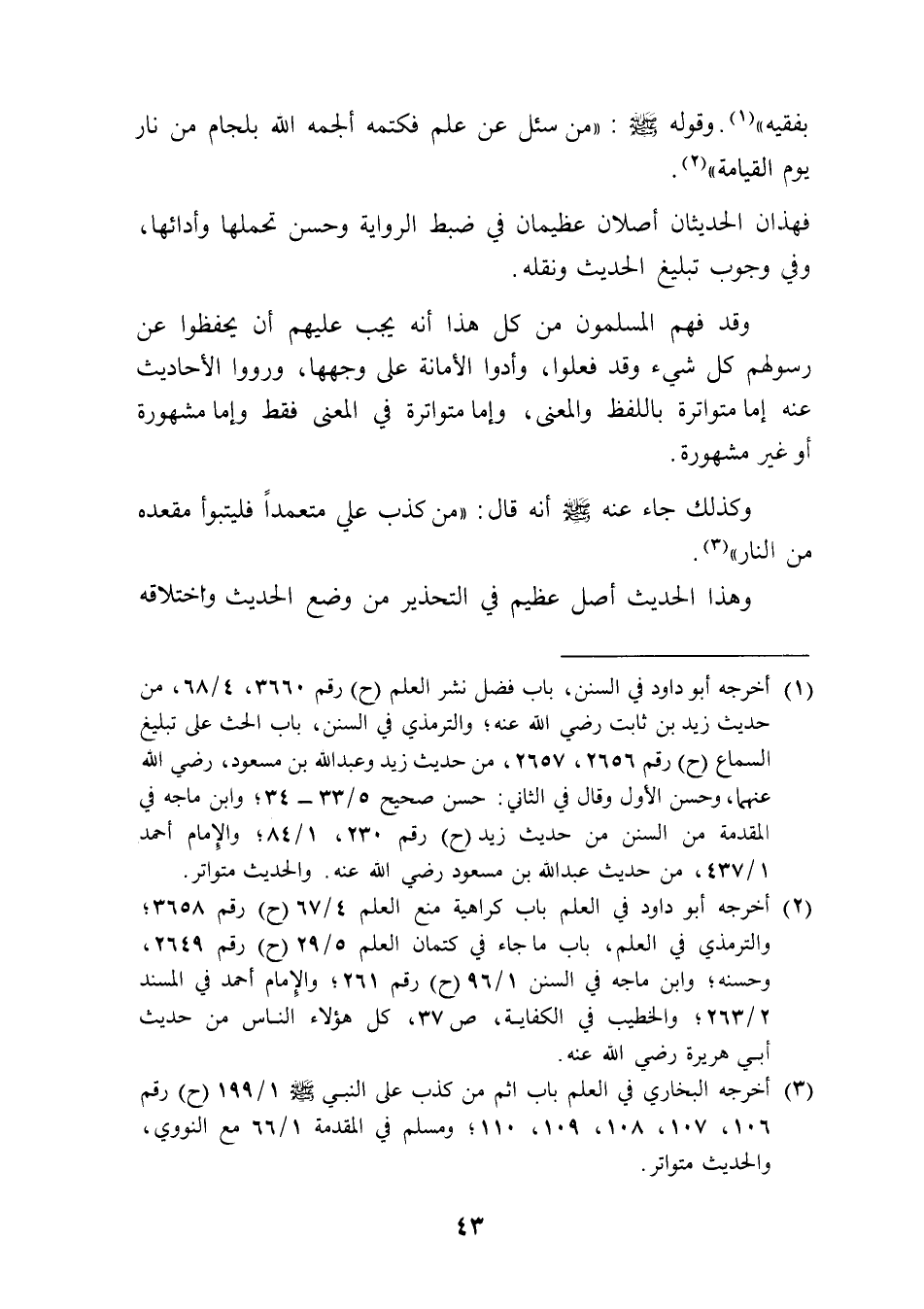 (¬1) أخرجه أبو داود في السنن، باب فضل نشر العلم (ح) رقم 3660، 4/ 68، من حديث زيد بن ثابت رضي الله عنه؛ والترمذي في السنن، باب الحث على تبليغ السماع (ح) رقم 2656، 2657، من حديث زيد وعبد الله بن مسعود، رضي الله عنهما، وحسن الأول وقال في الثاني: حسن صحيح 5/ 33 - 34؛ وابن ماجه في المقدمة من السنن من حديث زيد (ح) رقم 230، 1/ 84؛ والإِمام أحمد 1/ 437، من حديث عبد الله بن مسعود رضي الله عنه. والحديث متواتر.