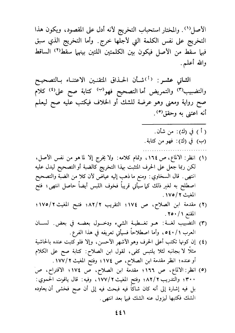 الثاني عشر: (أ) شأن الحذاق المتقنين الاعتناء بالتصحيح والتضبيب (¬3) والتمريض أما التصحيح فهو (ب) كتابة صح على (¬4) كلام صح رواية ومعنى وهو عرضة للشك أو الخلاف فيكتب عليه صح ليعلم أنه اعتنى به وحقق (¬5).