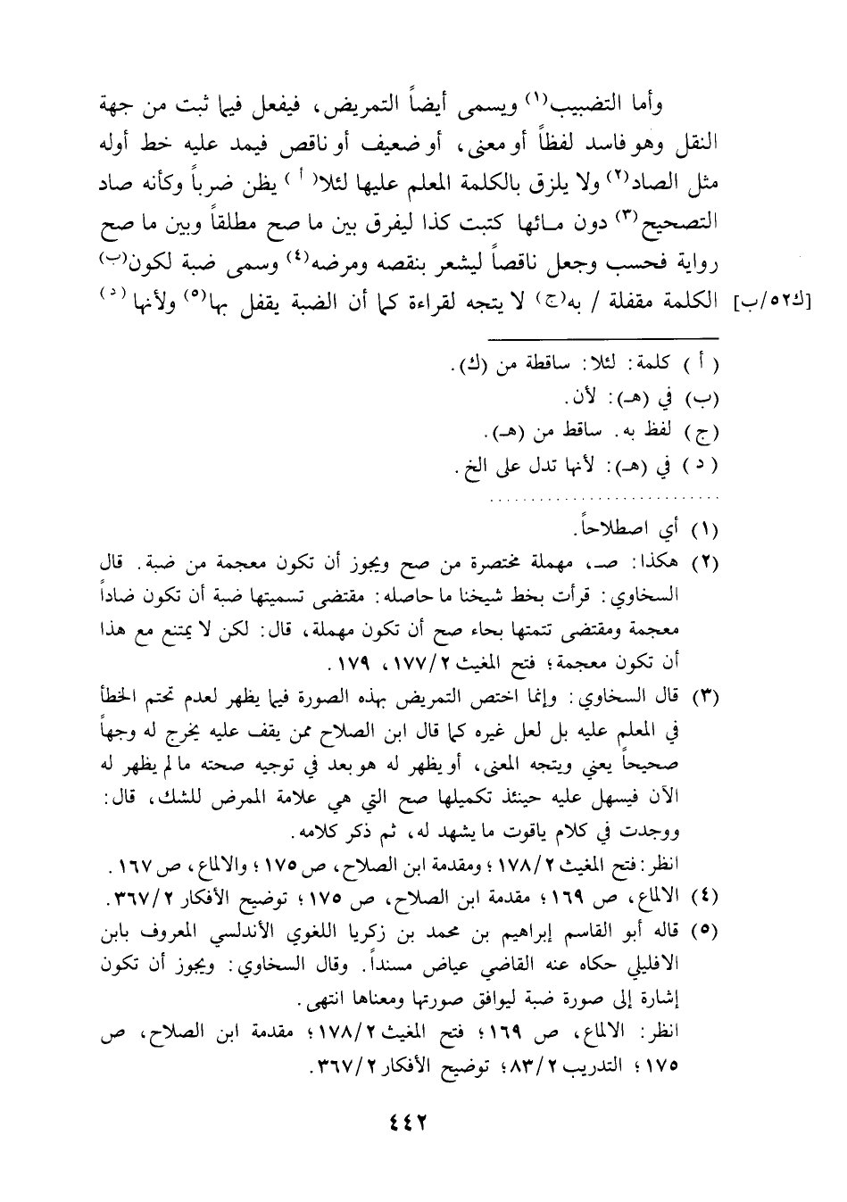 (¬3) قال السخاوي: وإنما اختص التمريض بهذه الصورة فيما يظهر لعدم تحتم الخطأ في المعلم عليه بل لعل غيره كما قال ابن الصلاح ممن يقف عليه يخرج له وجهًا صحيحًا يعني ويتجه المعنى، أو يظهر له هو بعد في توجيه صحته ما لم يظهر له الآن فيسهل عليه حينئذ تكميلها صح التي هي علامة الممرض للشك، قال: ووجدت في كلام ياقوت ما يشهد له، ثم ذكر كلامه.