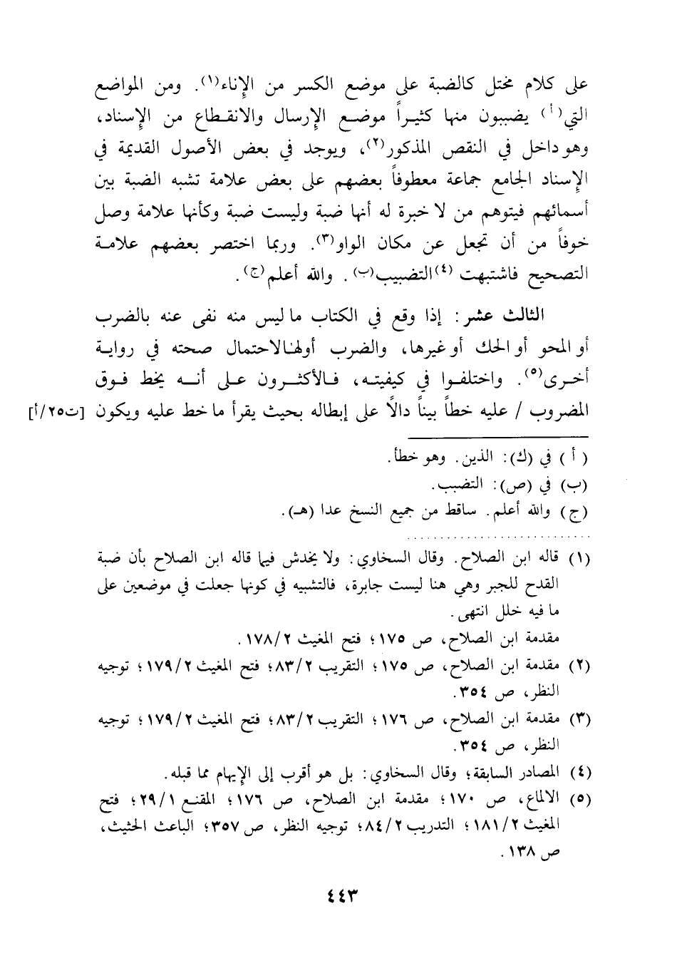 على كلام مختل كالضبة علي موضع الكسر من الإِناء (¬1). ومن المواضع التي (أ) يضببون منها كثيرًا موضع الإِرسال والانقطاع من الإِسناد، وهو داخل في النقص المذكور (¬2)، ويوجد في بعض الأصول القديمة في الإِسناد الجامع جماعة معطوفًا بعضهم على بعض علامة تشبه الضبة بين أسمائهم فيتوهم من لا خبرة له أنها ضبة وليست ضبة وكأنها علامة وصل خوفًا من أن تجعل عن مكان الواو (¬3). وربما اختصر بعضهم علامة التصحيح فاشتبهت (¬4) التضبيب (ب). والله أعلم (ج).