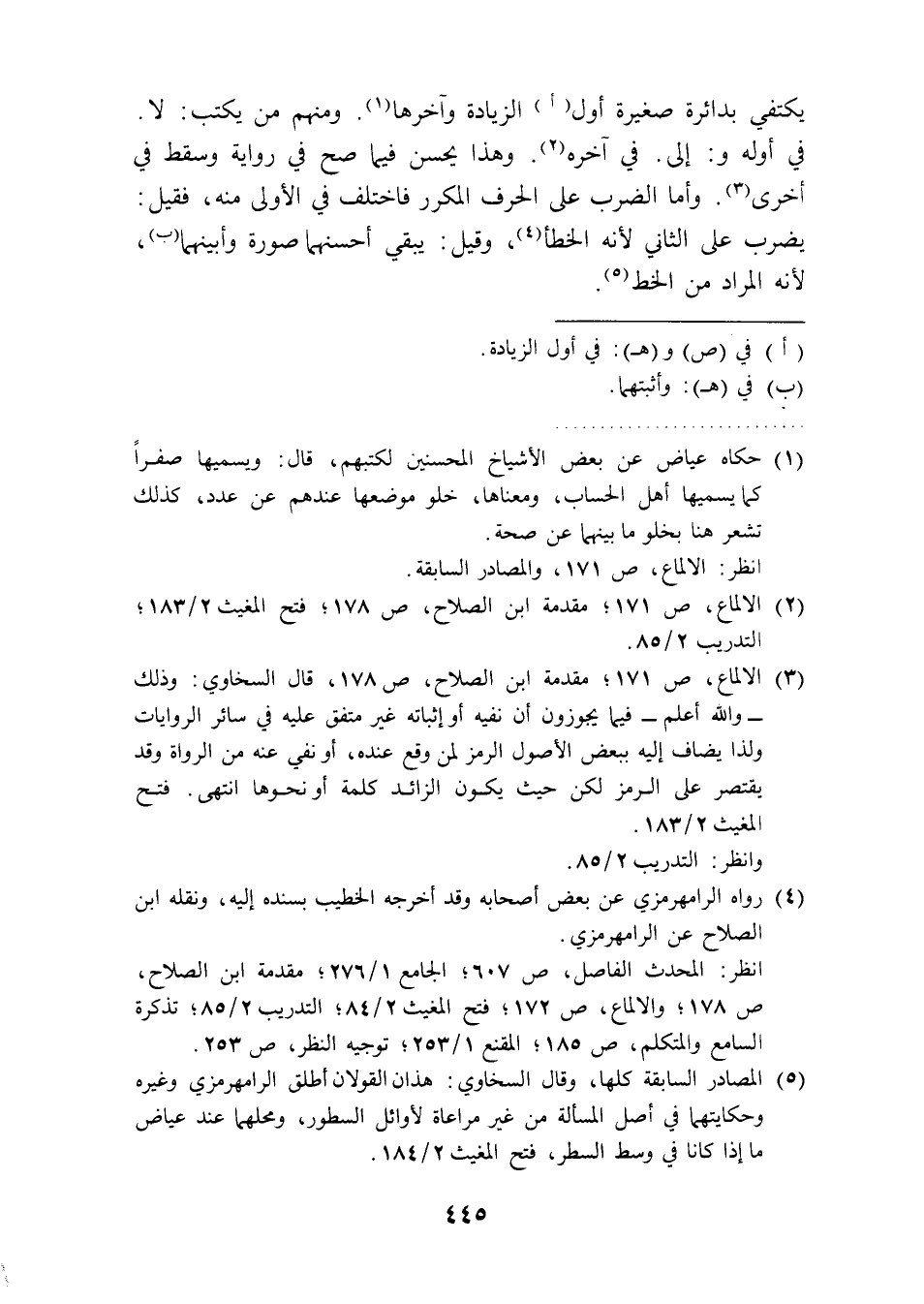 (¬5) المصادر السابقة كلها، وقال السخاوي: هذان القولان أطلق الرامهرمزي وغيره وحكايتهما في أصل المسألة من غير مراعاة لأوائل السطور، ومحلهما عند عياض ما إذا كانا في وسط السطر، فتح المغيث 2/ 184.