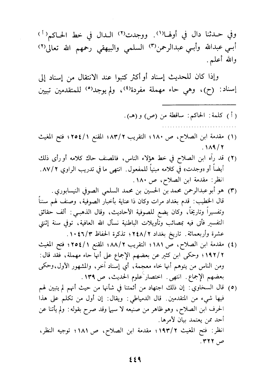 (¬4) مقدمة ابن الصلاح، ص 181؛ التقريب 2/ 88؛ المقنع 1/ 254؛ فتح المغيث 2/ 192؛ وحكى ابن كثير عن بعضهم الإِجماع على أنها حاء مهملة، فقد قال: ومن الناس من يتوهم أنها خاء معجمة، أي إسناد آخر، والمشهور الأول، وحكى بعضهم الإِجماع. انتهى. اختصار علوم الحديث، ص 139.