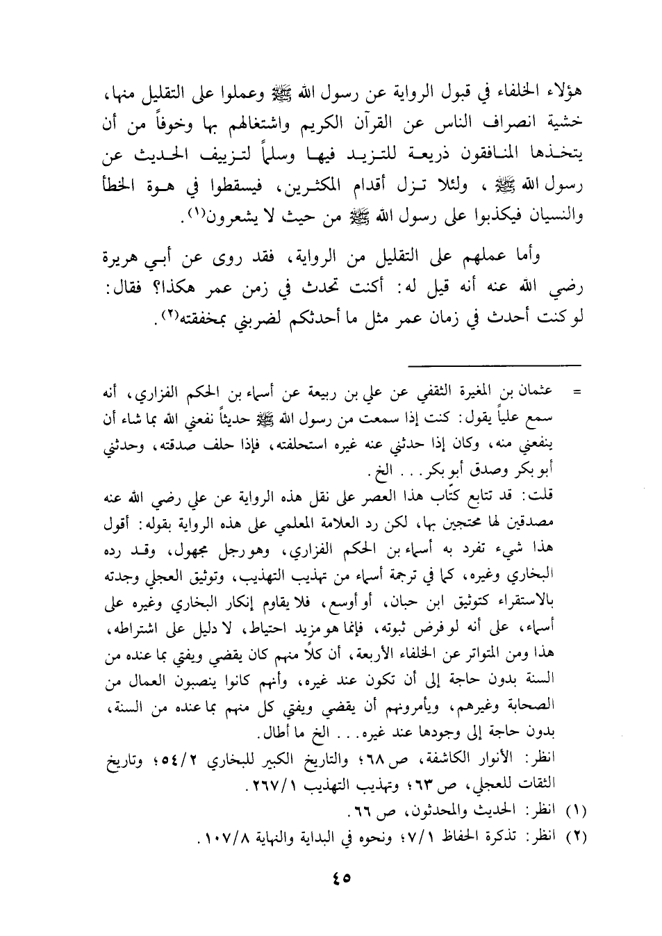 هؤلاء الخلفاء في قبول الرواية عن رسول الله - صلى الله عليه وسلم - وعملوا على التقليل منها، خشية انصراف الناس عن القرآن الكريم واشتغالهم بها وخوفًا من أن يتخذها المنافقون ذريعة للتزيد فيها وسلمًا لتزييف الحديث عن رسول الله - صلى الله عليه وسلم -، ولئلا تزل أقدام المكثرين، فيسقطوا في هوة الخطأ والنسيان فيكذبوا على رسول الله - صلى الله عليه وسلم - من حيث لا يشعرون (¬1).
