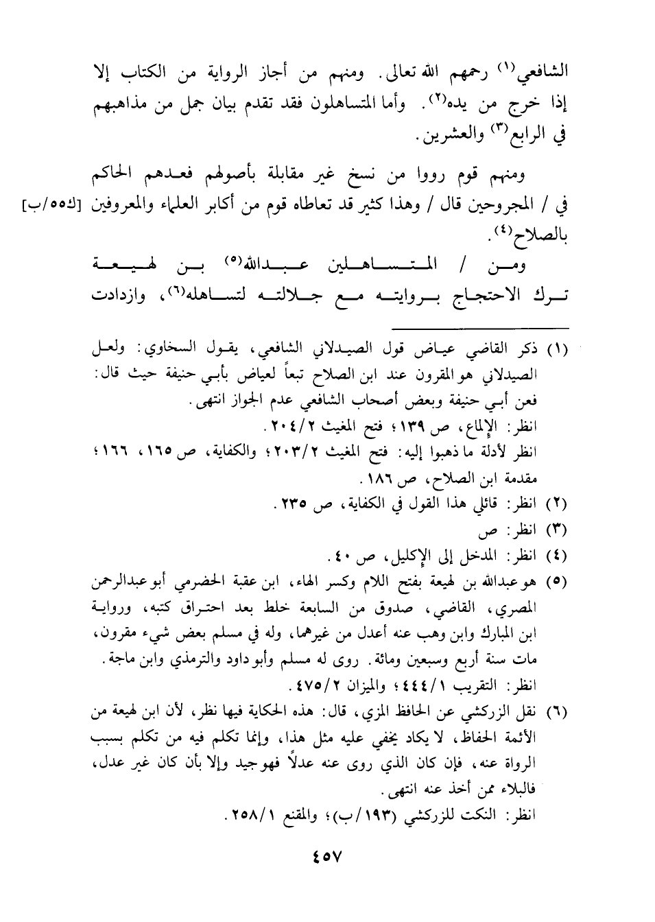 (¬1) ذكر القاضي عياض قول الصيدلاني الشافعي، يقول السخاوي: ولعل الصيدلاني هو المقرون عند ابن الصلاح تبعًا لعياض بأبي حنيفة حيث قال: فعن أبي حنيفة وبعض أصحاب الشافعي عدم الجواز انتهى.