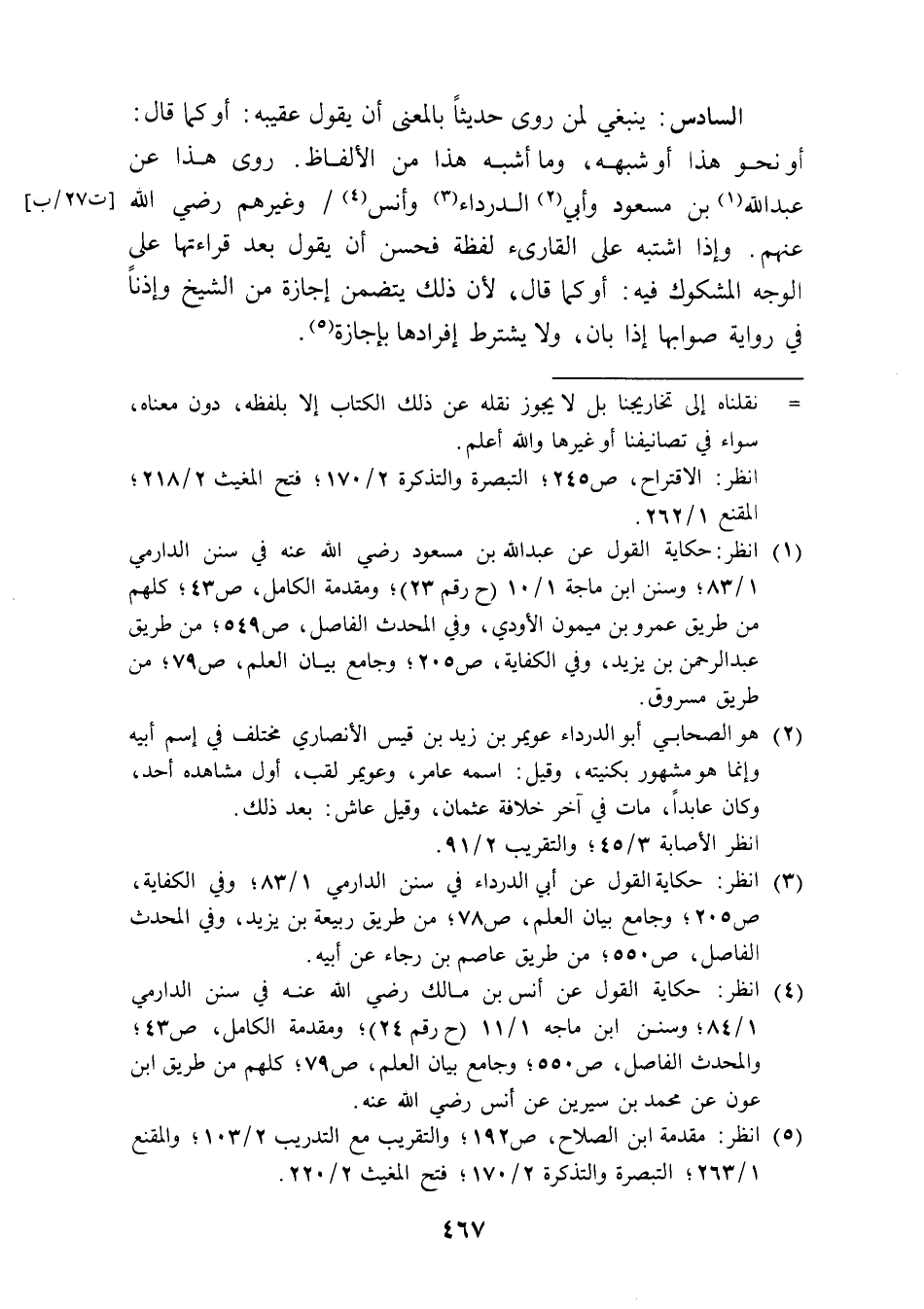 السادس: ينبغي لمن روى حديثًا بالمعنى أن يقول عقيبه: أو كما قال: أو نحو هذا أو شبهه، وما أشبه هذا من الألفاظ. روى هذا عن عبد الله (¬1) بن مسعود وأبي (¬2) الدرداء (¬3) وأنس (¬4) وغيرهم رضي الله عنهم. وإذا اشتبه على القاريء لفظة فحسن أن يقول بعد قراءتها على الوجه المشكوك فيه: أو كما قال، لأن ذلك يتضمن إجازة من الشيخ وإذنًا في رواية صوابها إذا بان، ولا يشترط إفرادها بإجازة (¬5).