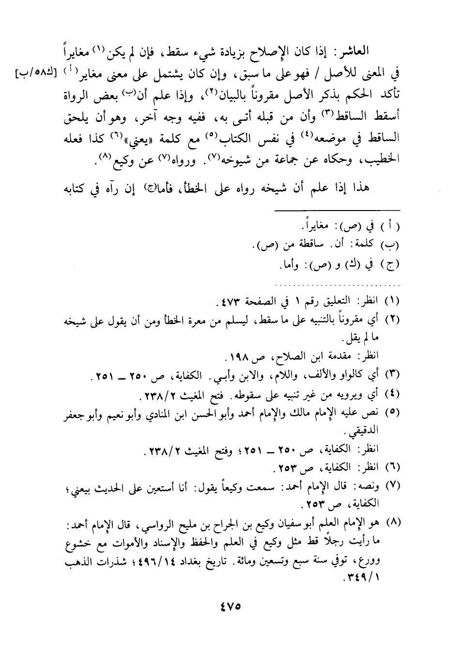 العاشر: إذا كان الإِصلاح بزيادة شيِء سقط، فإن لم يكن (¬1) مغايرًا في المعنى للأصل فهو علي ما سبق، وإن كان يشتمل علي معنى مغاير (أ) تأكد الحكم بذكر الأصل مقرونًا بالبيان (¬2)، وإذا علم أن (ب) بعض الرواة أسقط الساقط (¬3) وأن من قبله أتى به، ففيه وجه آخر، وهو أن يلحق الساقط في موضعه (¬4) في نفس الكتاب (¬5) مع كلمة "يعني" (¬6) كذا فعله الخطيب، وحكاه عن جماعة من شيوخه (7). ورواه (¬7) عن وكيع (¬8).