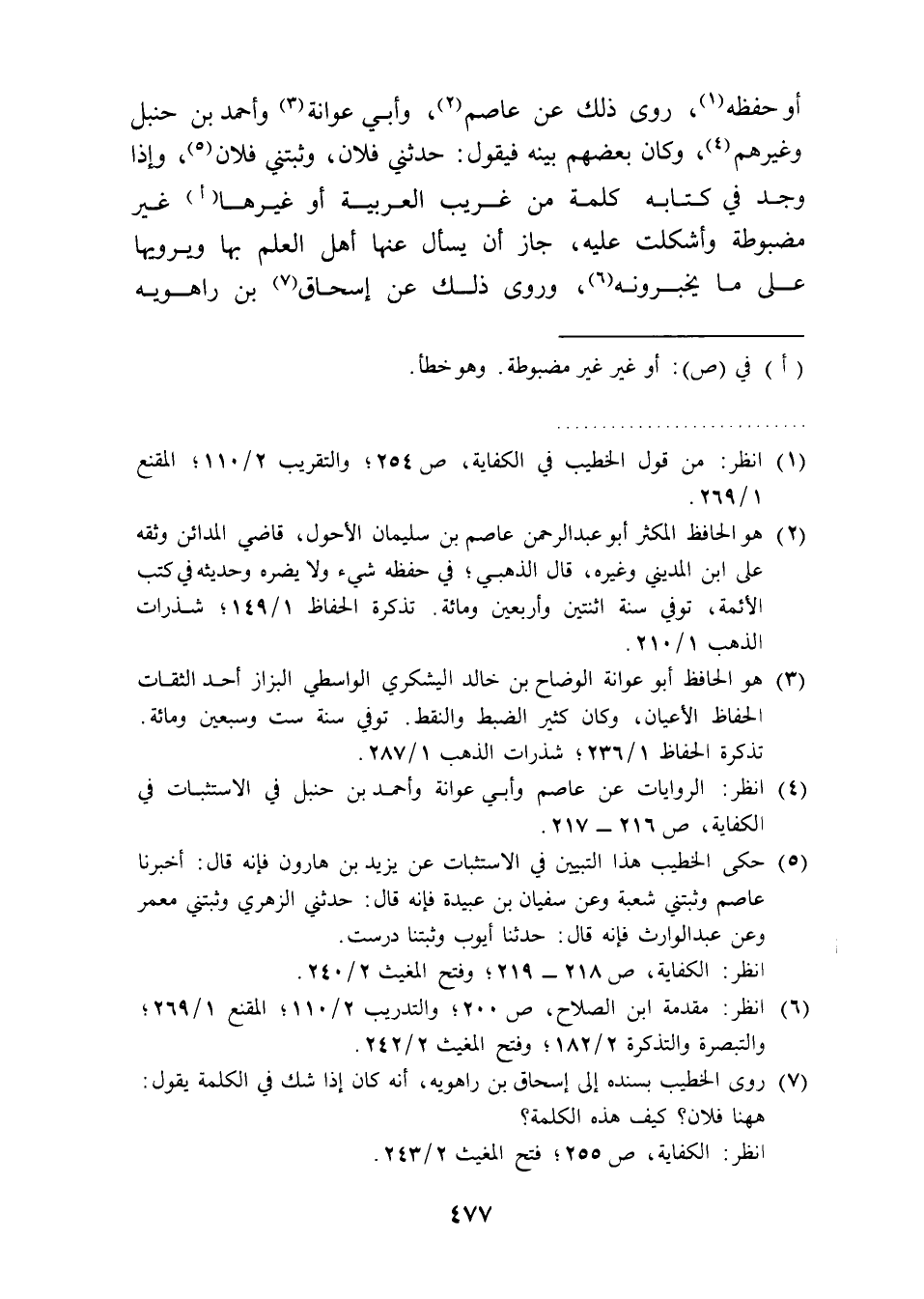 (¬4) انظر: الروايات عن عاصم وأبي عوانة وأحمد بن حنبل في الاستثبات في الكفاية، ص 216 - 217.