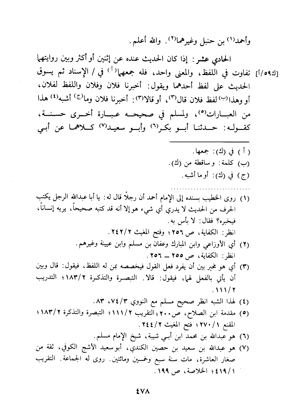 (¬1) روى الخطيب بسنده إلى الإِمام أحمد أن رجلًا قال له: يا أبا عبد الله الرجل يكتب الحرف من الحديث لا يدري أي شيء هو إلا أنه قد كتبه صحيحًا، يريه إنسانًا، فيخبره؟ فقال: لا بأس به.