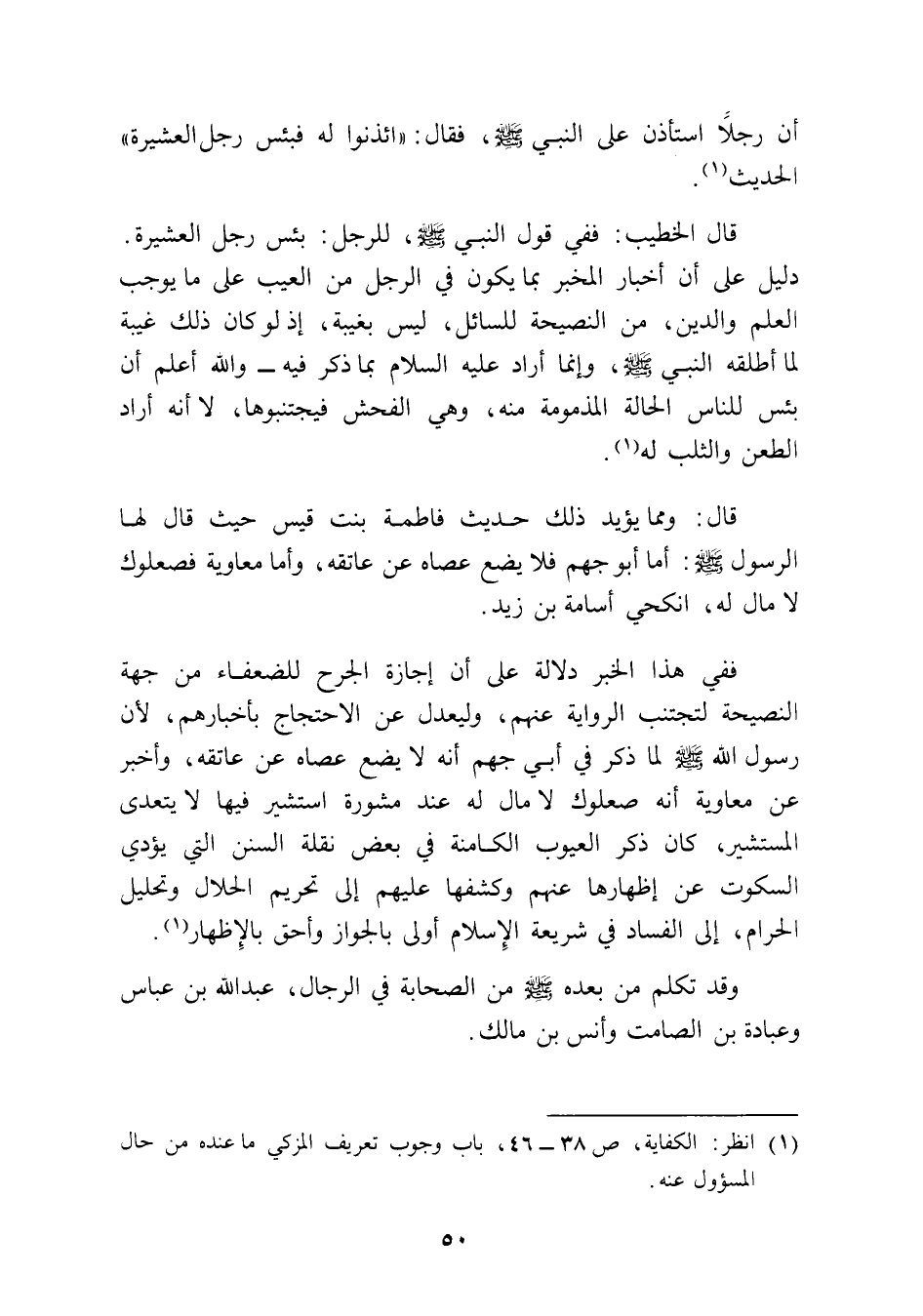 ففي هذا الخبر دلالة على أن إجازة الجرح للضعفاء من جهة النصيحة لتجتنب الرواية عنهم، وليعدل عن الاحتجاج بأخبارهم، لأن رسول الله - صلى الله عليه وسلم - لما ذكر في أبي جهم أنه لا يضع عصاه عن عاتقه، وأخبر عن معاوية أنه صعلوك لا مال له عند مشورة استشير فيها لا يتعدى المستشير، كان ذكر العيوب الكامنة في بعض نقلة السنن التي يؤدي السكوت عن إظهارها عنهم وكشفها عليهم إلى تحريم الحلال وتحليل الحرام، إلى الفساد في شريعة الإِسلام أولى بالجواز وأحق بالإِظهار (¬1).