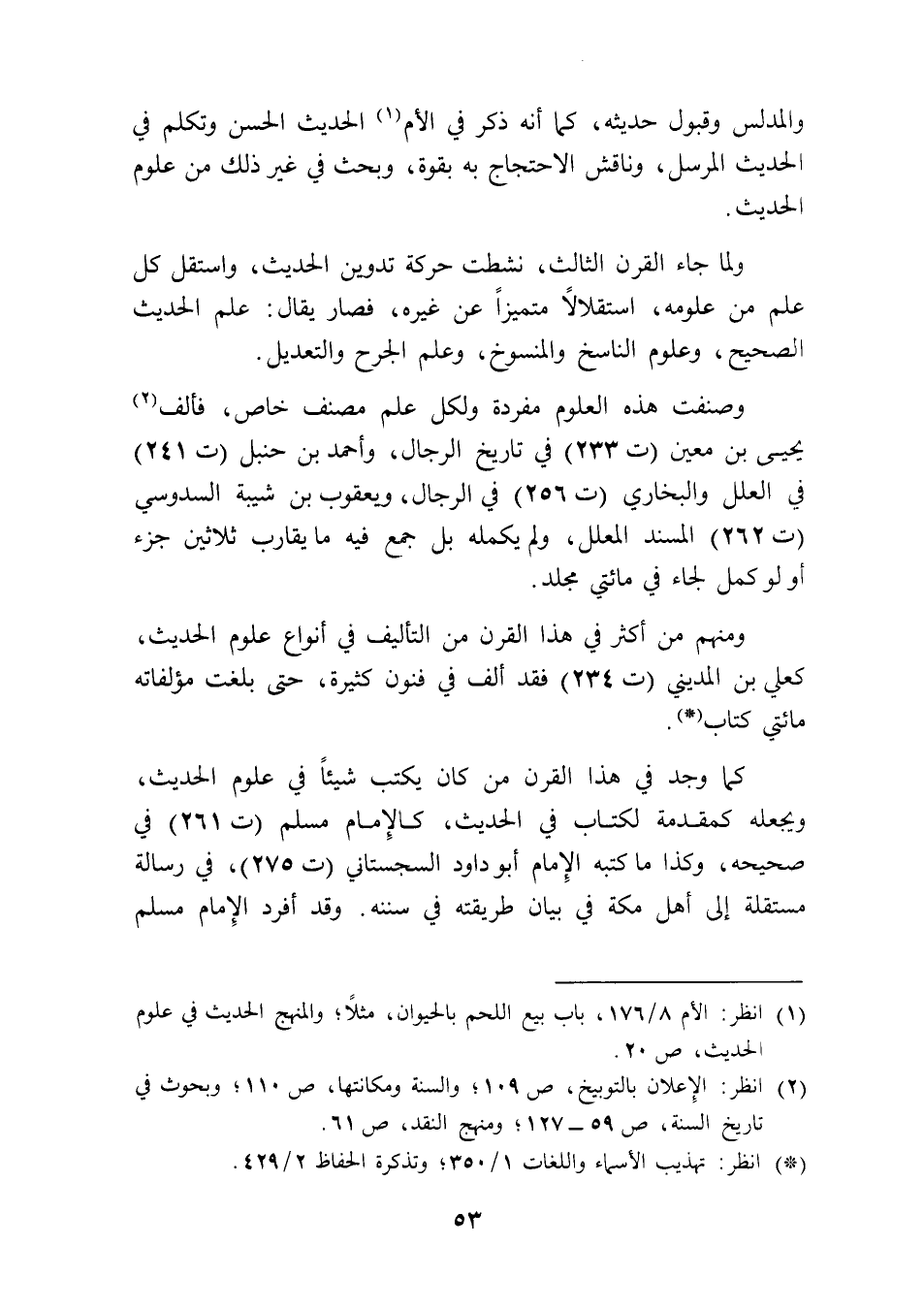كما وجد في هذا القرن من كان يكتب شيئًا في علوم الحديث، ويجعله كمقدمة لكتاب في الحديث، كالإِمام مسلم (ت 261) في صحيحه, وكذا ما كتبه الإِمام أبو داود السجستاني (ت 275)، في رسالة مستقلة إلى أهل مكة في بيان طريقته في سننه. وقد أفرد الإِمام مسلم