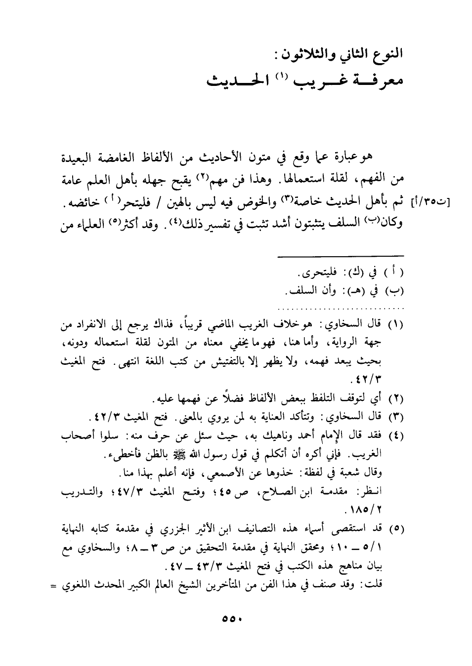 هو عبارة عما وقع في متون الأحاديث من الألفاظ الغامضة البعيدة من الفهم، لقلة استعمالها. وهذا فن مهم (¬2) يقبح جهله بأهل العلم عامة ثم بأهل الحديث خاصة (¬3) والخوض فيه ليس بالهين فليتحر (أ) خائضه. وكان (ب) السلف يتثبتون أشد تثبت في تفسير ذلك (¬4). وقد أكثر (¬5) العلماء من