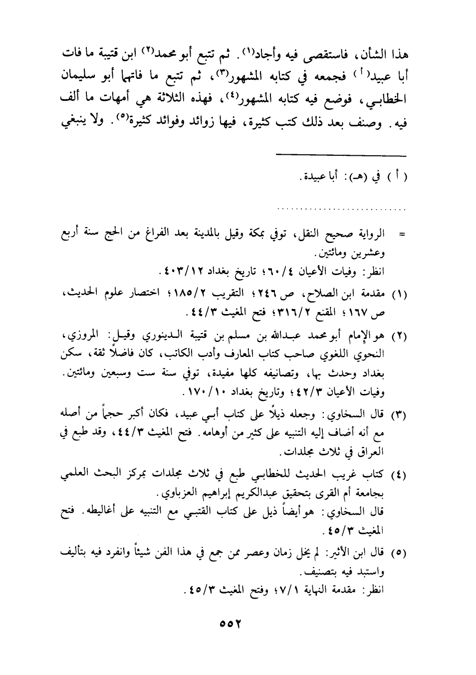 (¬3) قال السخاوي: وجعله ذيلًا على كتاب أبي عبيد، فكان أكبر حجمًا من أصله مع أنه أضاف إليه التنبيه على كثير من أوهامه. فتح المغيث 3/ 44، وقد طبع في العراق في ثلاث مجلدات.