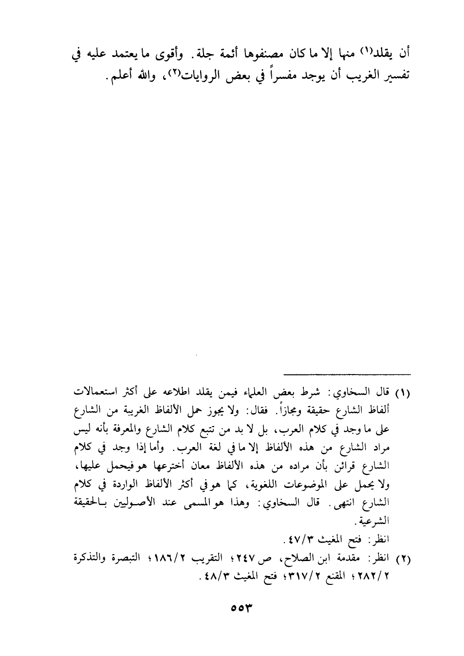 أن يقلد (¬1) منها إلا ما كان مصنفوها أئمة جلة. وأقوى ما يعتمد عليه في تفسير الغريب أن يوجد مفسرًا في بعض الروايات (¬2)، والله أعلم.