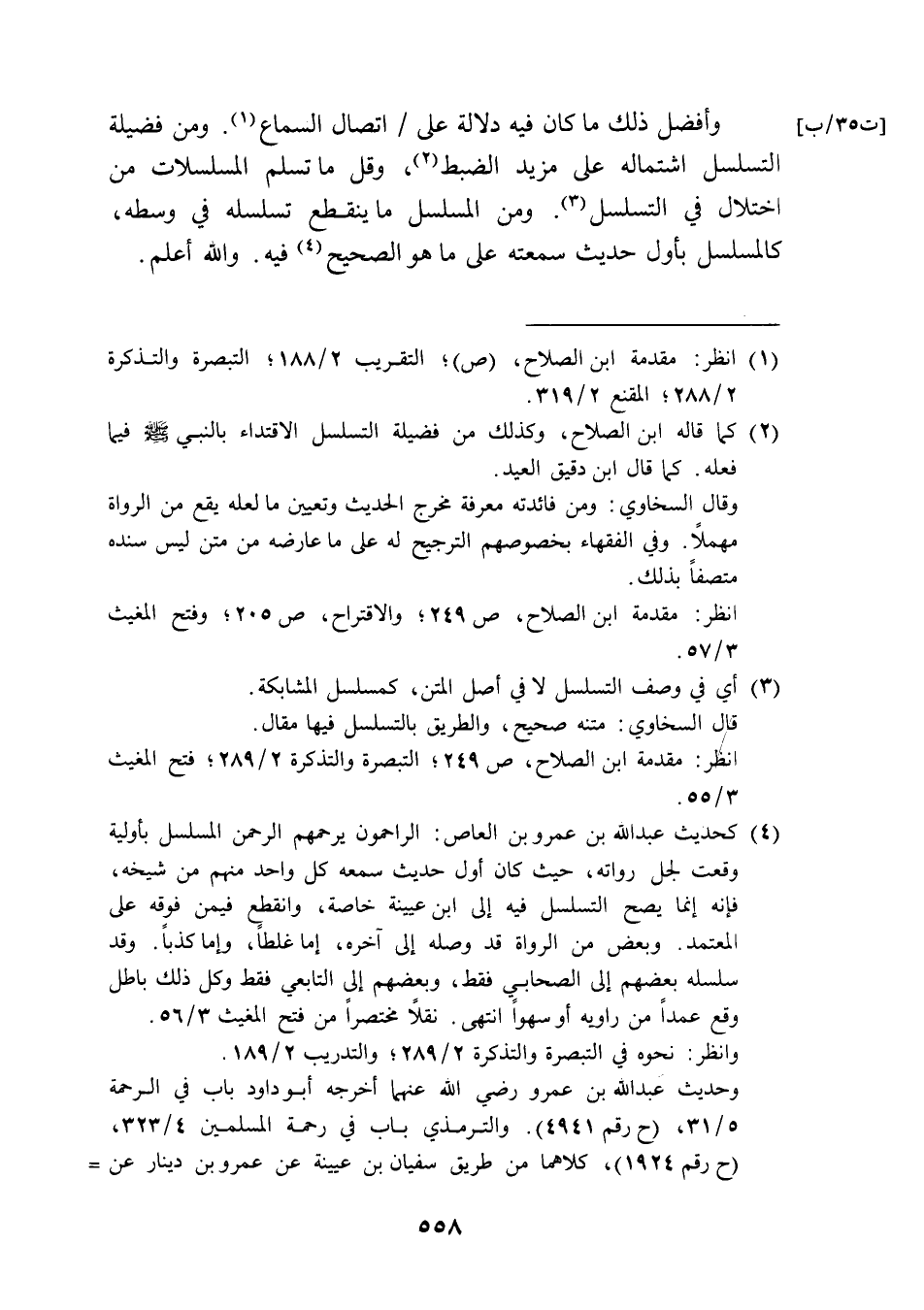 (¬2) كما قاله ابن الصلاح، وكذلك من فضيلة التسلسل الاقتداء بالنبي - صلى الله عليه وسلم - فيما فعله. كما قال ابن دقيق العيد.
