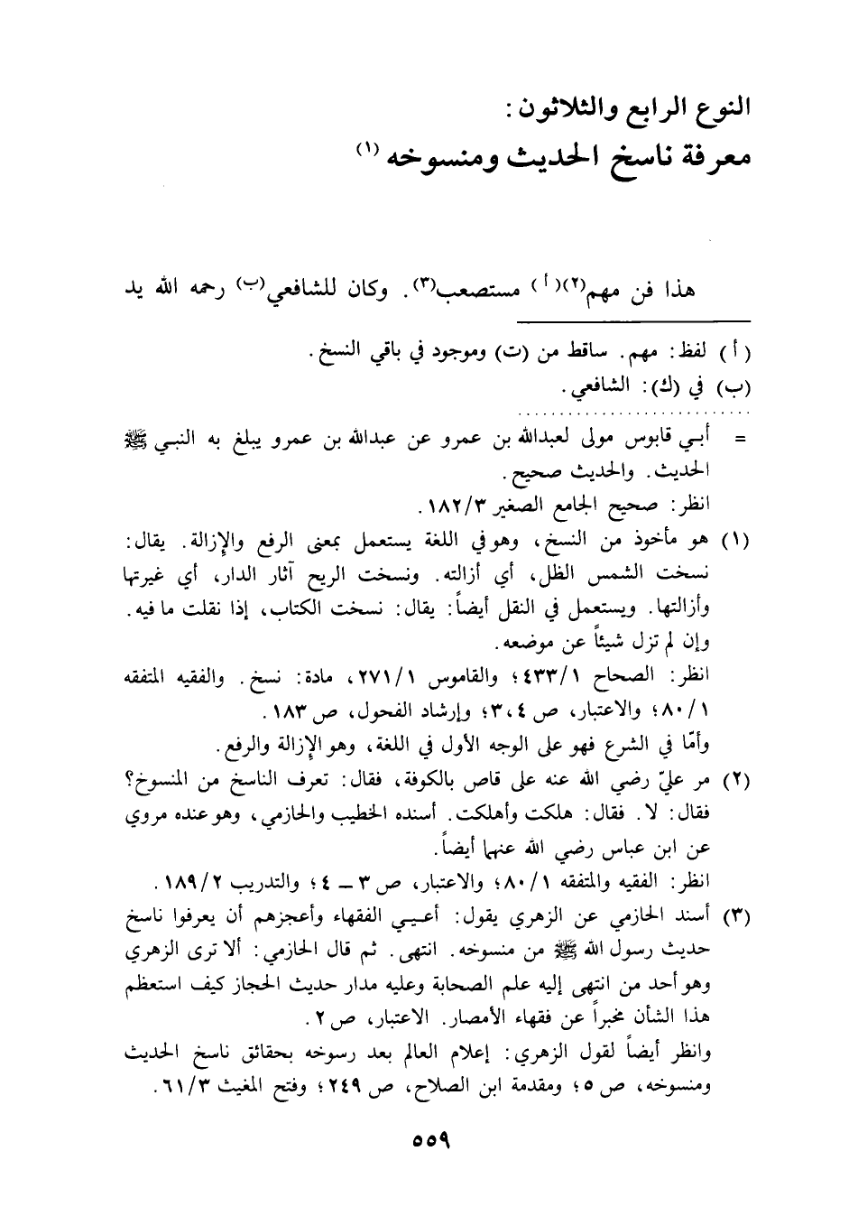 (¬3) أسند الحازمي عن الزهري يقول: أعيي الفقهاء وأعجزهم أن يعرفوا ناسخ حديث رسول الله - صلى الله عليه وسلم - من منسوخه. انتهى. ثم قال الحازمي: ألا ترى الزهري وهو أحد من انتهى إليه علم الصحابة وعليه مدار حديث الحجاز كيف استعظم هذا الشأن مخبرًا عن فقهاء الأمصار. الاعتبار، ص 2.