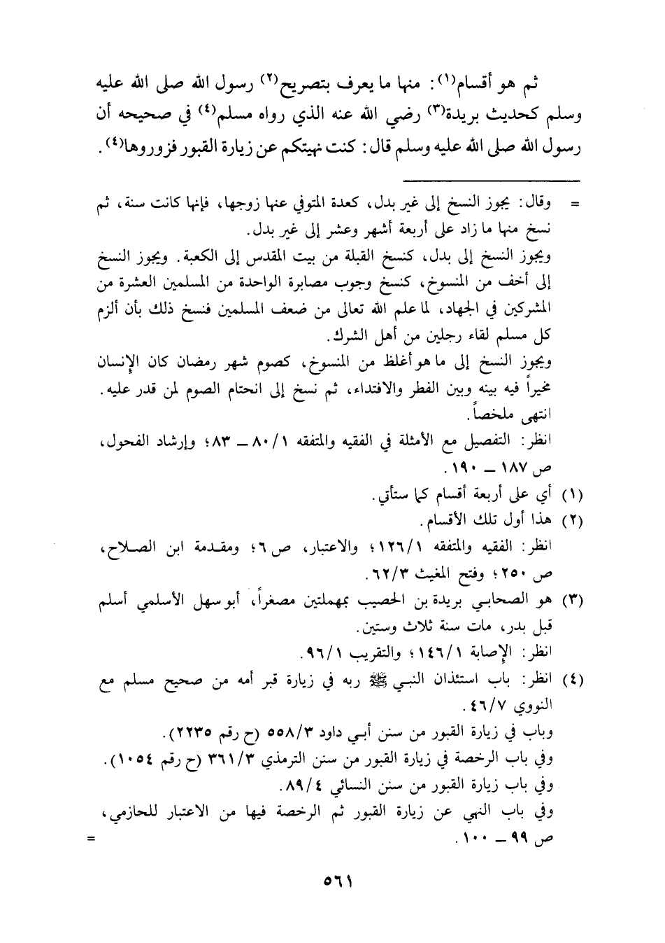 ثم هو أقسام (¬1): منها ما يعرف بتصريح (¬2) رسول الله صلى الله عليه وسلم كحديث بريدة (¬3) رضي الله عنه الذي رواه مسلم (¬4) في صحيحه أن رسول الله صلى الله عليه وسلم قال: كنت نهيتكم عن زيارة القبور فزوروها (4).