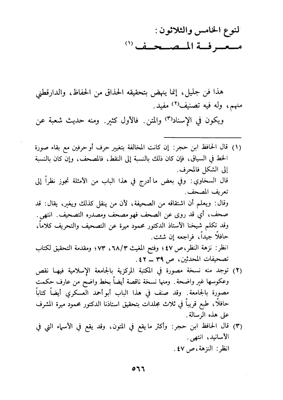 (¬1) قال الحافظ ابن حجر: إن كانت المخالفة بتغيير حرف أو حرفين مع بقاء صورة الخط في السياق، فإن كان ذلك بالنسبة إلى النقط، فالمصحف، وإن كان بالنسبة إلى الشكل فالمحرف.