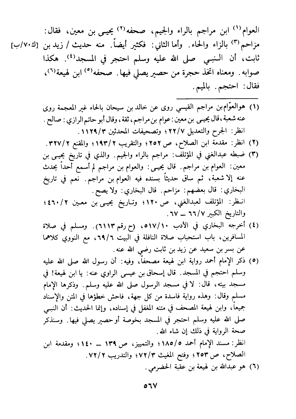 (¬3) ضبطه عبد الغني في المؤتلف: مراجم بالراء والجيم. والذي في تاريخ يحيى بن معين: العوام بن مراجم. قال يحيى: والعوام بن مراجم لم أسمع أحدًا يحدث عنه إلا شعبة، ثم ساق حديثًا بسنده فيه العوام بن مراجم. نعم في تاريخ البخاري: قال بعضهم: مزاحم. قال البخاري: ولا يصح.