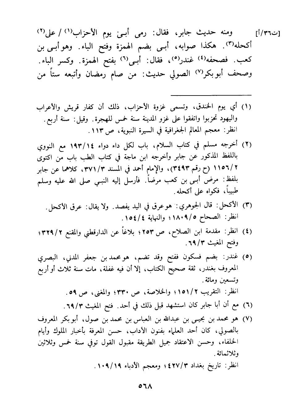 ومنه حديث جابر، فقال: رمى أبى يوم الأحزاب (¬1) على (¬2) أكحله (¬3). هكذا صوابه، أبى بضم الهمزة وفتح الباء. وهو أبى بن كعب. فصحفه (¬4) غندر (¬5)، فقال: أبى (¬6) بفتح الهمزة. وكسر الباء. وصحف أبو بكر (¬7) الصولي حديث: من صام رمضان وأتبعه ستًا من