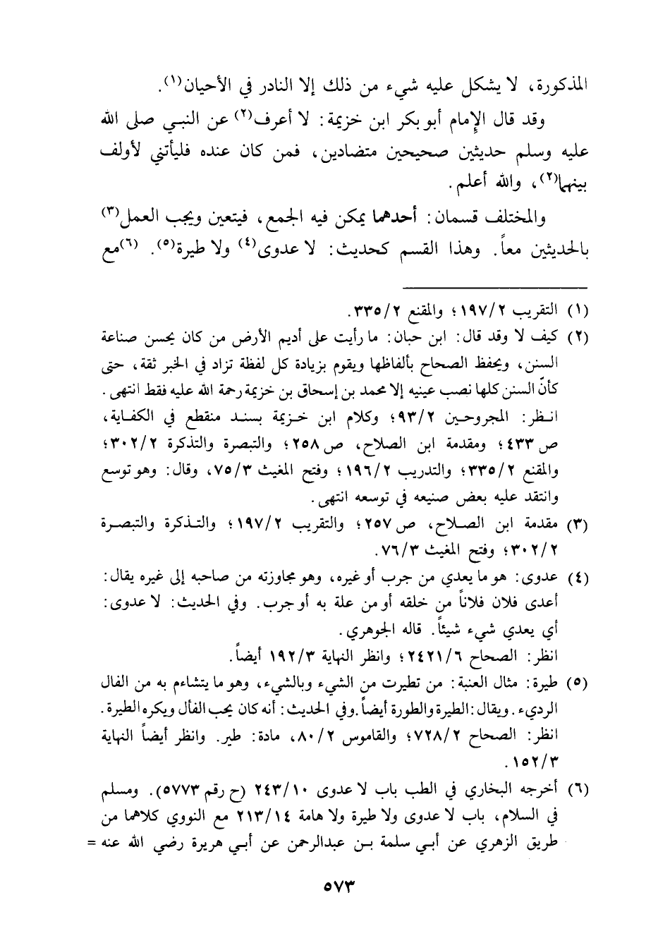 (¬6) أخرجه البخاري في الطب باب لا عدوى 10/ 243 (ح رقم 5773). ومسلم في السلام، باب لا عدوى ولا طيرة ولا هامة 14/ 213 مع النووي كلاهما من طريق الزهري عن أبي سلمة بن عبد الرحمن عن أبي هريرة رضي الله عنه =