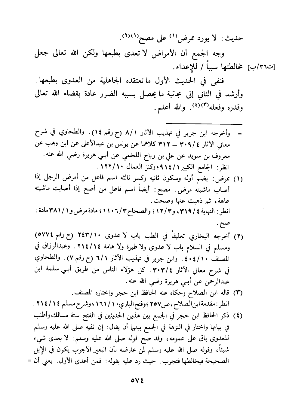 (¬2) أخرجه البخاري تعليقًا في الطب باب لا عدوى 10/ 243 (ح رقم 5774) ومسلم في السلام باب لا عدوى ولا طيرة ولا هامة 14/ 214. وعبد الرزاق في المصنف 10/ 404. وابن جرير في تهذيب الآثار 1/ 6 (ح رقم 7). والطحاوي في شرح معاني الآثار 4/ 303. كل هؤلاء الناس من طريق أبي سلمة ابن عبد الرحمن عن أبي هريرة رضي الله عنه.