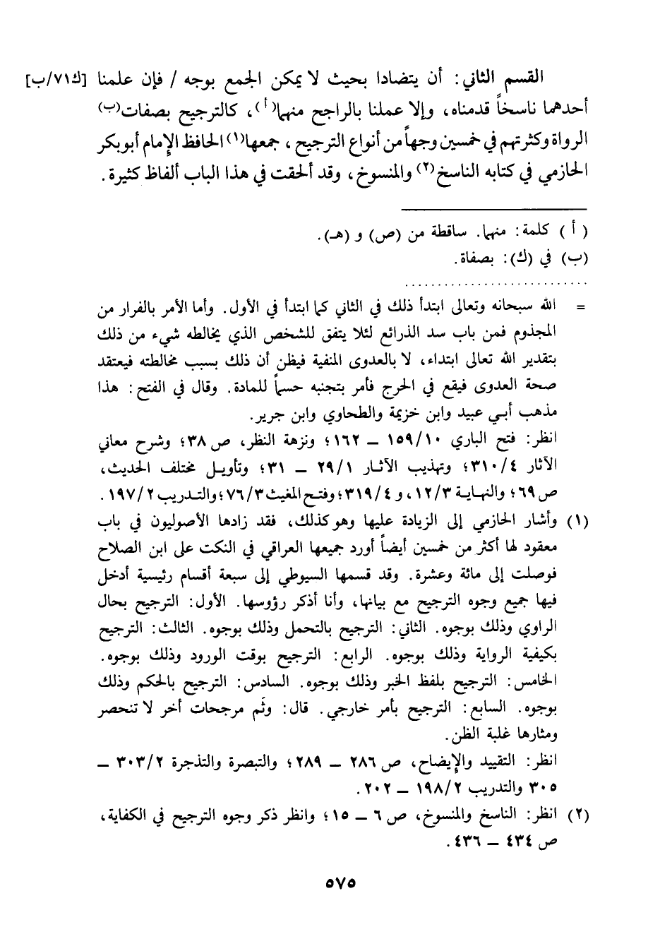(¬2) انظر: الناسخ والمنسوخ، ص 6 - 15؛ وانظر ذكر وجوه الترجيح في الكفاية، ص 434 - 436.