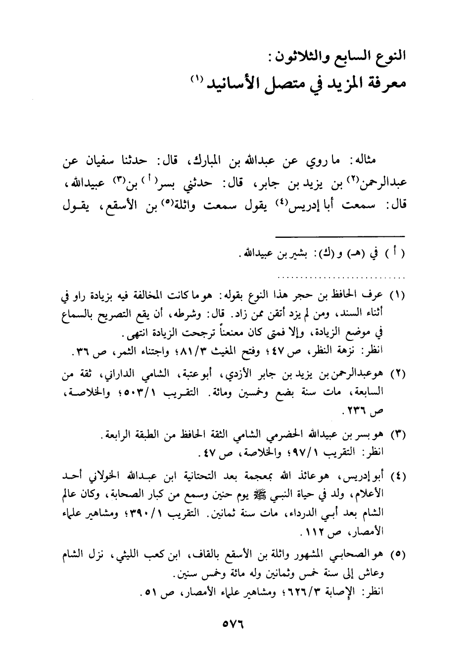 مثاله: ما روي عن عبد الله بن المبارك، قال: حدثنا سفيان عن عبد الرحمن (¬2) بن يزيد بن جابر، قال: حدثني بسر (أ) بن (¬3) عبيد الله، قال: سمعت أبا إدريس (¬4) يقول سمعت واثلة (¬5) بن الأسقع، يقول