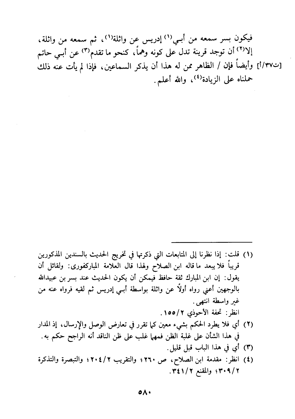 (¬1) قلت: إذا نظرنا إلى المتابعات التي ذكرتها في تخريج الحديث بالسندين المذكورين قريبًا فلا يبعد ما قاله ابن الصلاح ولهذا قال العلامة المباركفوري: ولقائل أن يقول: إن ابن المبارك ثقة حافظ فيمكن أن يكون الحديث عند بسر بن عبيد الله بالوجهين أعني رواه أولًا عن واثلة بواسطة أبي إدريس ثم لقيه فرواه عنه من غير واسطة انتهى.