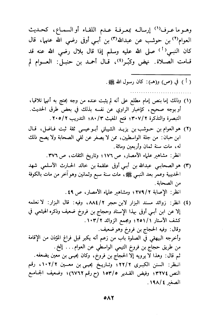 وهو ما عرف (¬1) إرساله بمعرفة عدم اللقاء أو السماع، كحديث العوام (¬2) بن حوشب عن عبد الله (¬3) بن أبي أوفى رضي الله عنهما، قال كان النبي (أ) صلى الله عليه وسلم إذا قال بلال رضي الله عنه قد قامت الصلاة. نهض وكبّر (¬4)، قال أحمد بن حنبل: العوام لم
