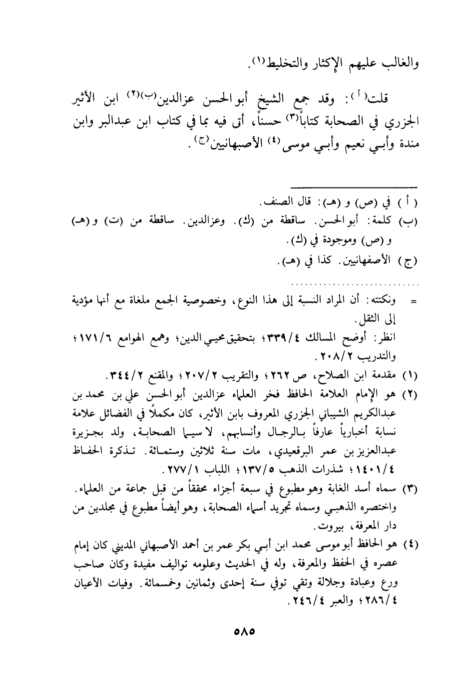 قلت (أ): وقد جمع الشيخ أبو الحسن عز الدين (ب) (¬2) ابن الأثير الجزري في الصحابة كتابًا (¬3) حسنًا، أتى فيه بما في كتاب ابن عبد البر وابن مندة وأبي نعيم وأبي موسى (¬4) الأصبهانيين (ج).