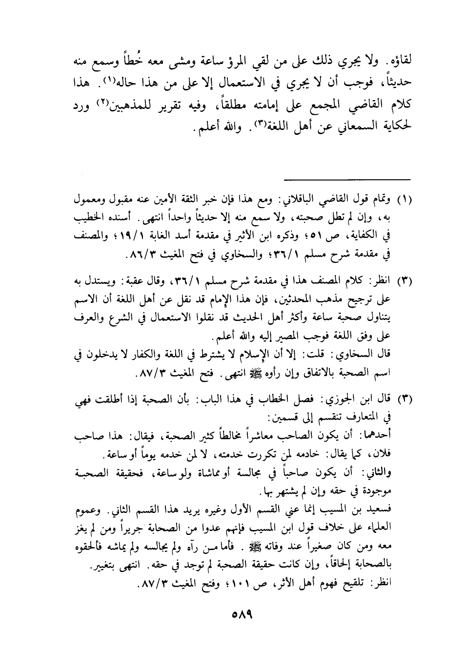 (¬1) وتمام قول القاضي الباقلاني: ومع هذا فإن خبر الثقة الأمين عنه مقبول ومعمول به، وإن لم تطل صحبته، ولا سمع منه إلا حديثًا واحدًا انتهى. أسنده الخطيب في الكفاية، ص 51؛ وذكره ابن الأثير في مقدمة أسد الغابة 1/ 19؛ والمصنف في مقدمة شرح مسلم 1/ 36؛ والسخاوي في فتح المغيث 3/ 86.