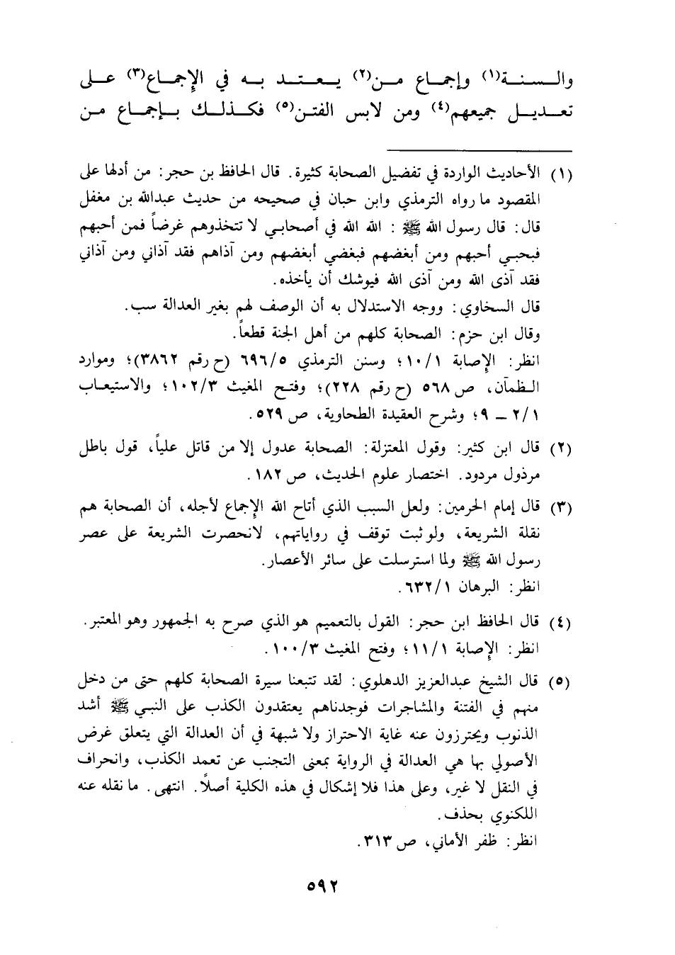 (¬5) قال الشيخ عبد العزيز الدهلوي: لقد تتبعنا سيرة الصحابة كلهم حتى من دخل منهم في الفتنة والمشاجرات فوجدناهم يعتقدون الكذب على النبي - صلى الله عليه وسلم - أشد الذنوب ويحترزون عنه غاية الاحتراز ولا شبهة في أن العدالة التي يتعلق غرض الأصولي بها هي العدالة في الرواية بمعنى التجنب عن تعمد الكذب، وانحراف في النقل لا غير، وعلى هذا فلا إشكال في هذه الكلية أصلًا. انتهى. ما نقله عنه اللكنوي بحذف.