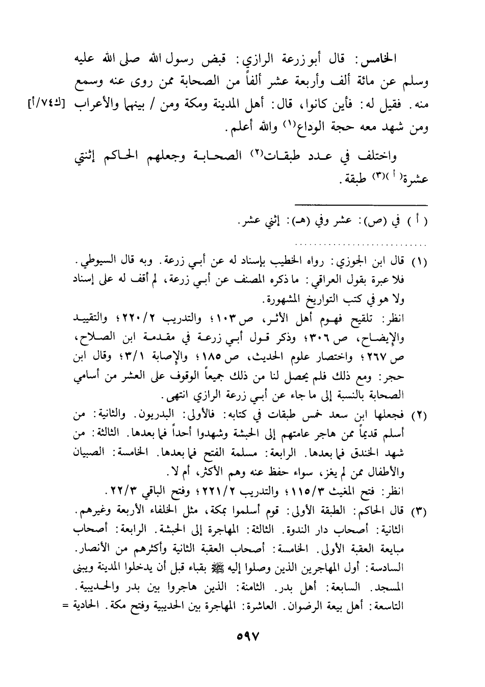 واختلف في عدد طبقات (¬2) الصحابة وجعلهم الحاكم إثنتي عشرة (أ) (¬3) طبقة.
