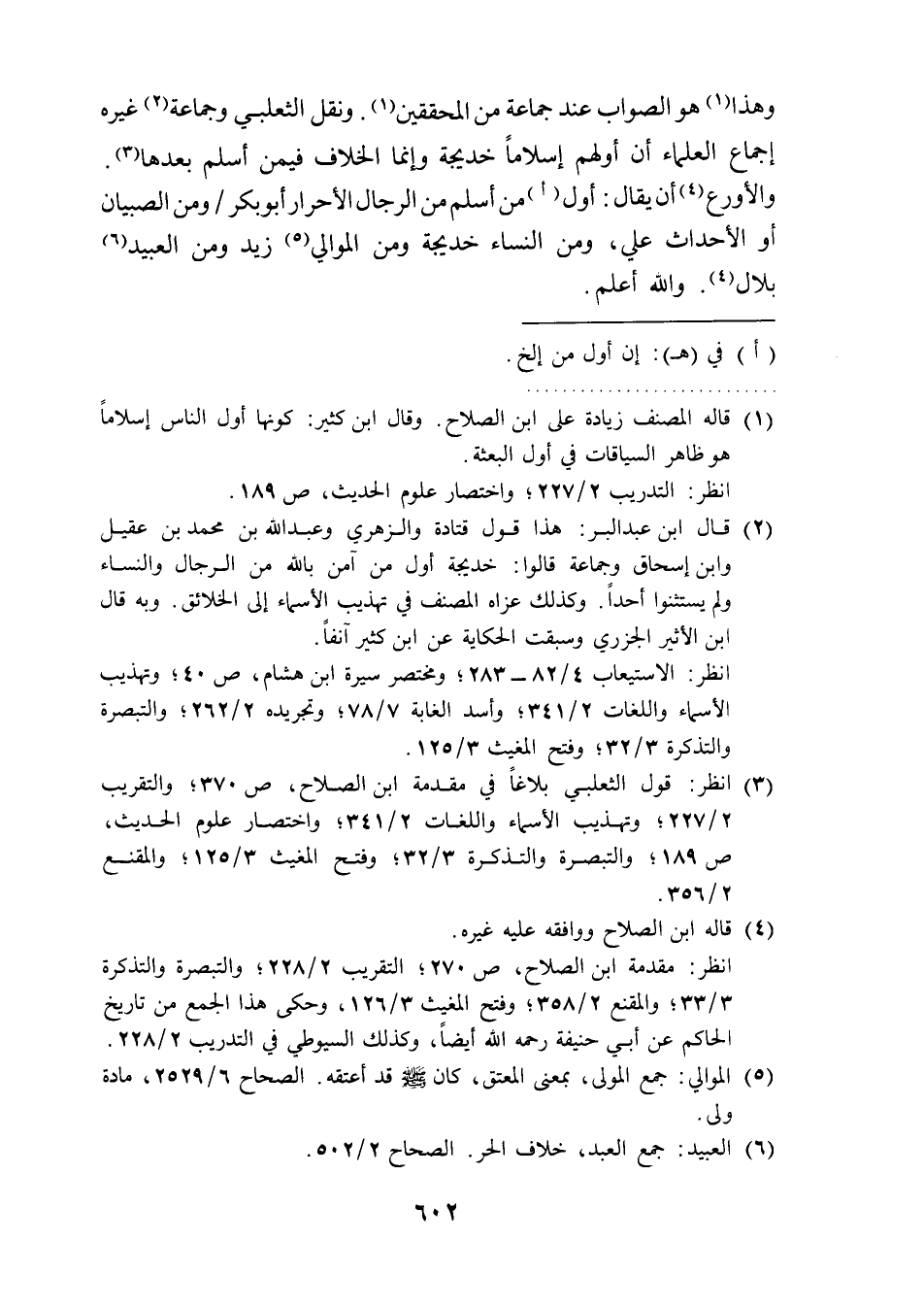 وهذا (1) هو الصواب عند جماعة من المحققين (¬1). ونقل الثعلبي وجماعة (¬2) غيره إجماع العلماء أن أولهم إسلامًا خديجة وإنما الخلاف فيمن أسلم بعدها (¬3). والأورع (¬4) أن يقال: أول (أ) من أسلم من الرجال الأحرار أبو بكر ومن الصبيان أو الأحداث علي، ومن النساء خديجة ومن الموالي (¬5) زيد ومن العبيد (¬6) بلال (4). والله أعلم.