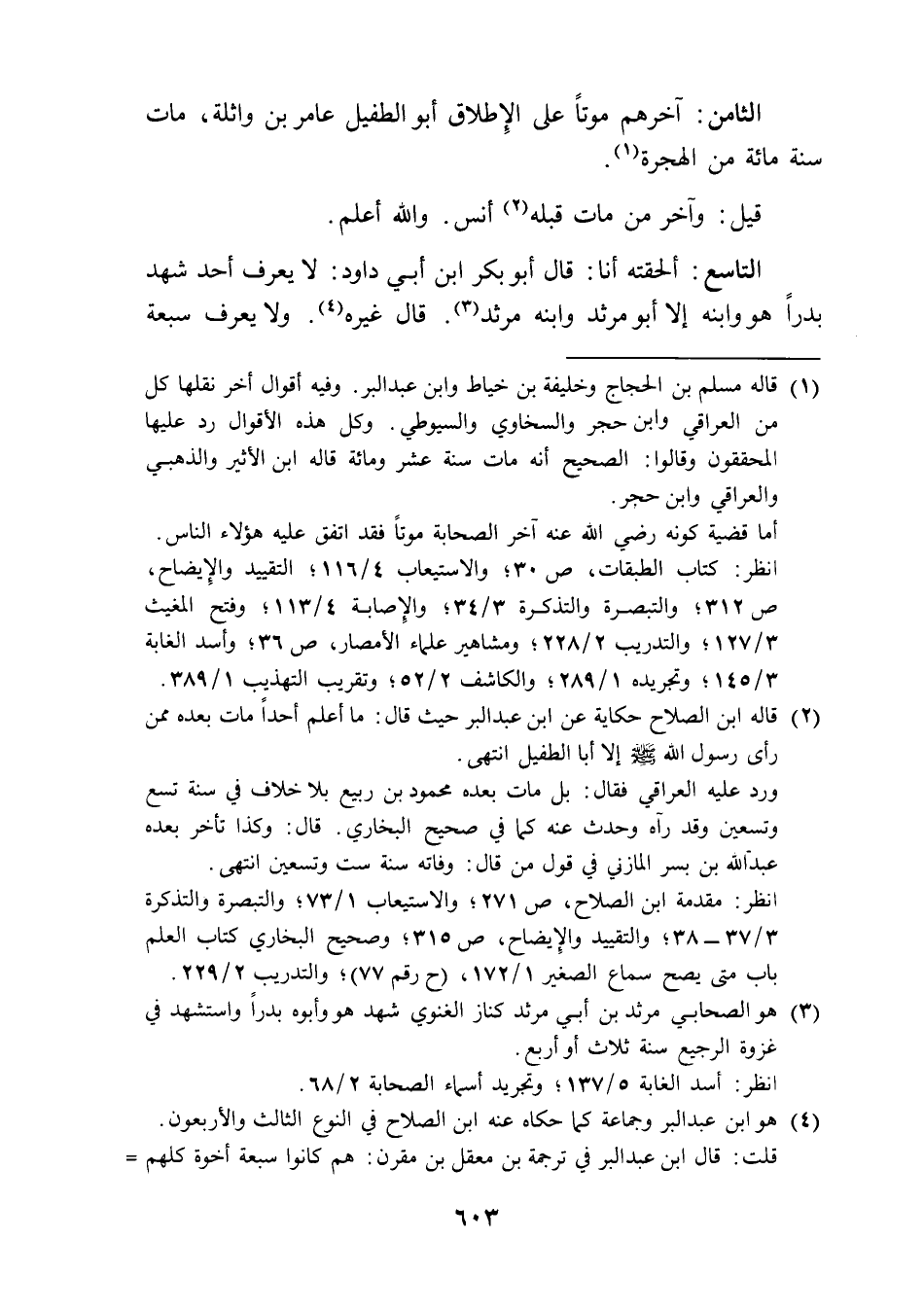 (¬2) قاله ابن الصلاح حكاية عن ابن عبد البر حيث قال: ما أعلم أحدًا مات بعده ممن رأى رسول الله - صلى الله عليه وسلم - إلا أبا الطفيل انتهى.