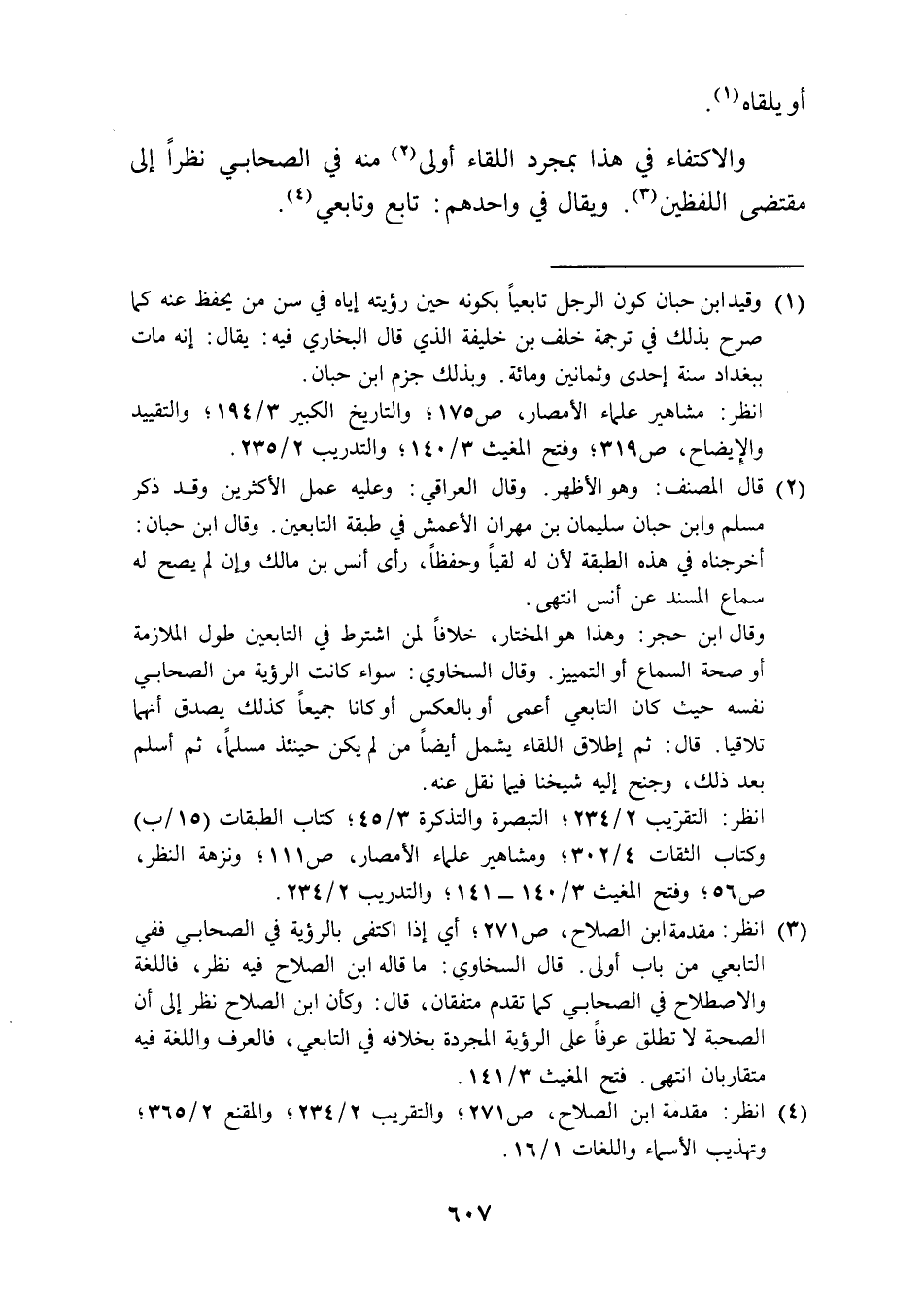 (¬3) انظر: مقدم ابن الصلاح، ص 271؛ أي إذا اكتفى بالرؤية في الصحابي ففي التابعي من باب أولى. قال السخاوي: ما قاله ابن الصلاح فيه نظر، فاللغة والاصطلاح في الصحابي كما تقدم متفقان، قال: وكأن ابن الصلاح نظر إلى أن الصحبة لا تطلق عرفًا على الرؤية المجردة بخلافه في التابعي، فالعرف واللغة فيه متقاربان انتهى. فتح المغيث 3/ 141.