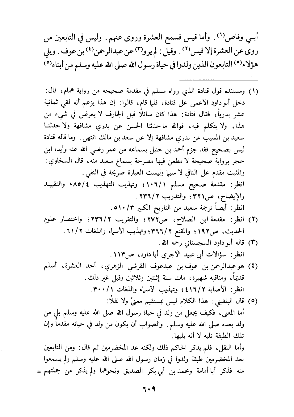 أبي وقاص (¬1). وأما قيس فسمع العشرة وروى عنهم. وليس في التابعين من روى عن العشرة إلا قيس (¬2). وقيل: لم يرو (¬3) عن عبد الرحمن (¬4) بن عوف. ويلي هؤلاء (5) التابعون الذين ولدوا في حياة رسول الله صلى الله عليه وسلم من أبناء (¬5)