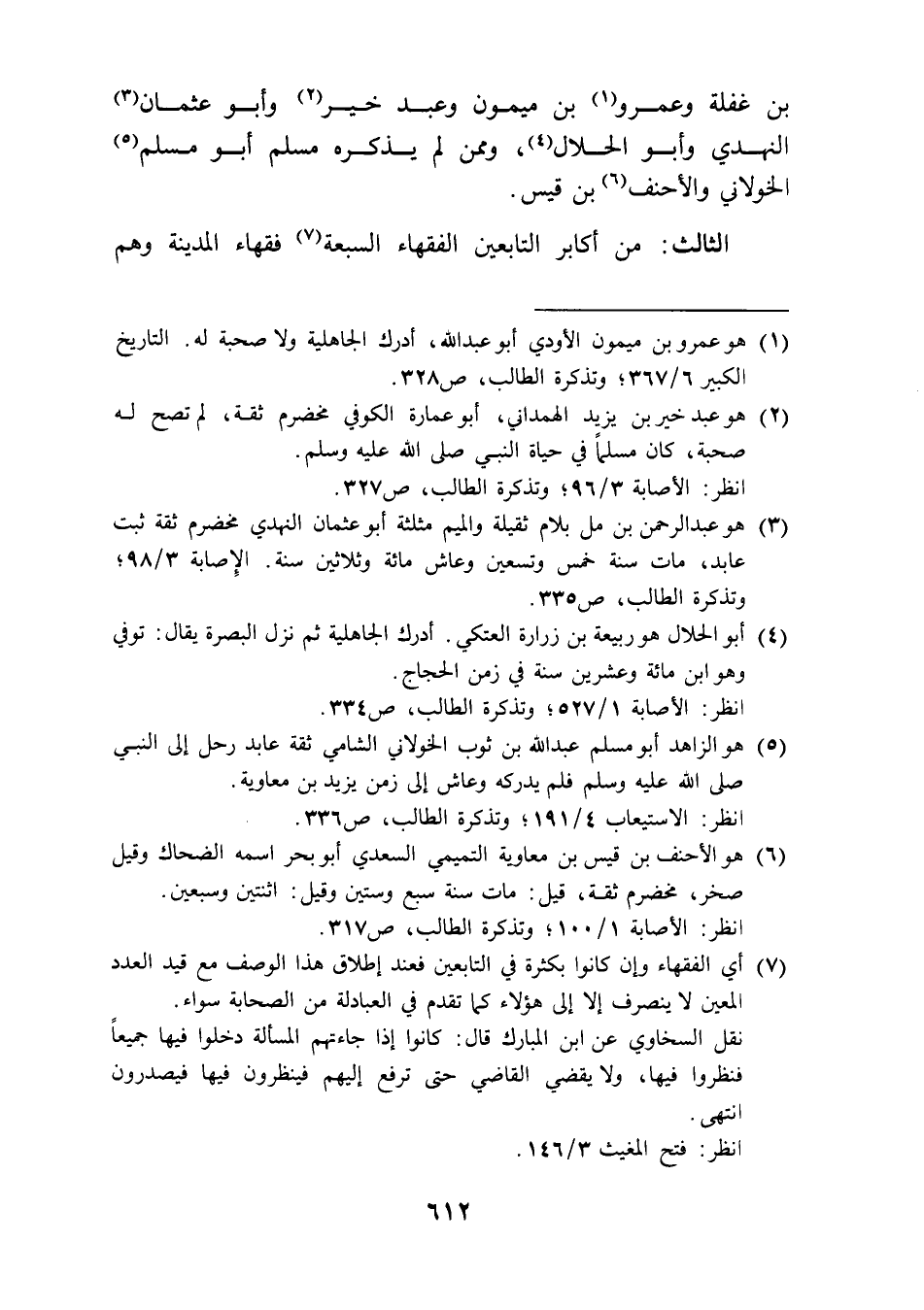 (¬7) أي الفقهاء وإن كانوا بكثرة في التابعين فعند إطلاق هذا الوصف مع قيد العدد المعين لا ينصرف إلا إلى هؤلاء كما تقدم في العبادلة من الصحابة سواء.