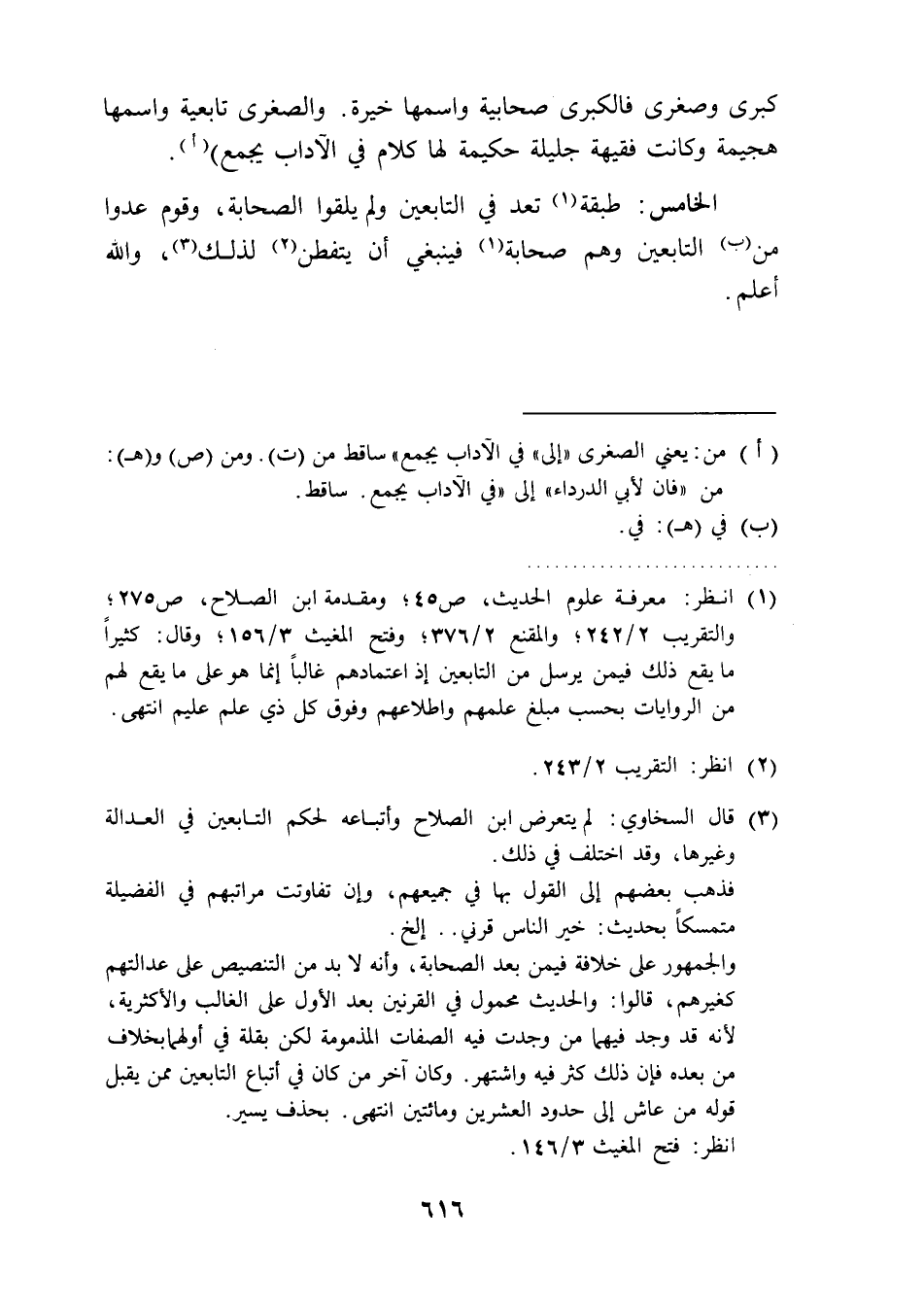 (¬3) قال السخاوي: لم يتعرض ابن الصلاح وأتباعه لحكم التابعين في العدالة وغيرها، وقد اختلف في ذلك.