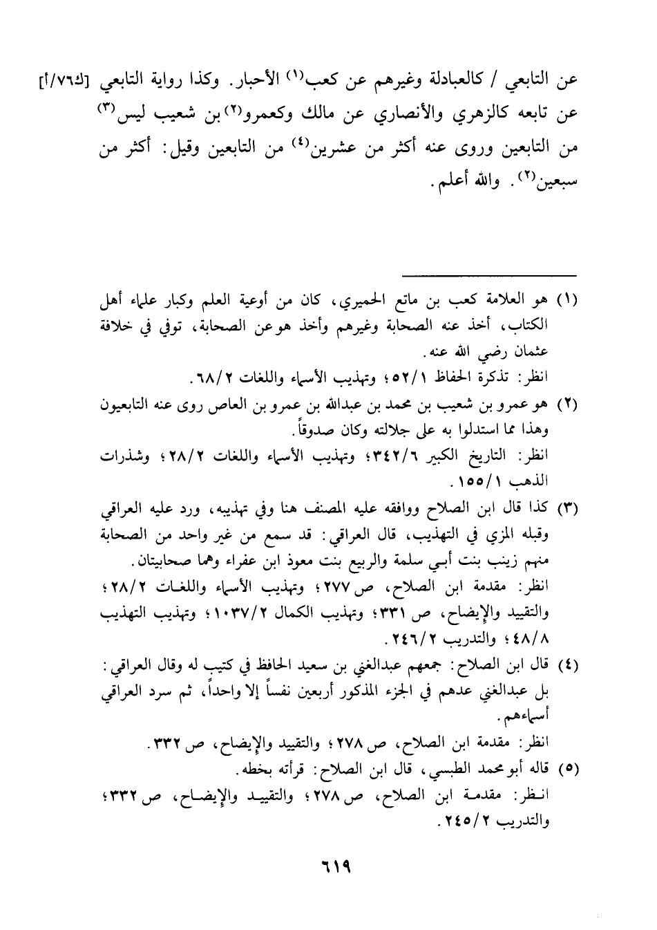 عن التابعي كالعبادلة وغيرهم عن كعب (¬1) الأحبار. وكذا رواية التابعي عن تابعه كالزهري والأنصاري عن مالك وكعمرو (¬2) بن شعيب ليس (¬3) من التابعين وروى عنه أكثر من عشرين (¬4) من التابعين وقيل: أكثر من سبعين (¬5). والله أعلم.