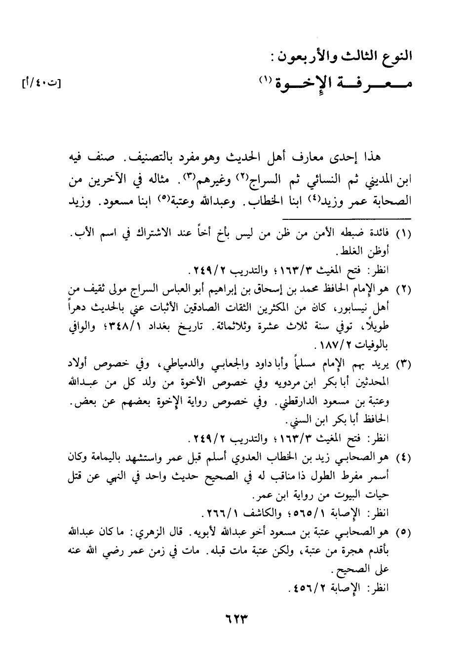 (¬3) يريد بهم الإِمام مسلمًا وأبا داود والجعابي والدمياطي، وفي خصوص أولاد المحدثين أبا بكر بن مردويه وفي خصوص الأخوة من ولد كل من عبد الله وعتبة بن مسعود الدارقطني. وفي خصوص رواية الإِخوة بعضهم عن بعض. الحافظ أبا بكر بن السني.
